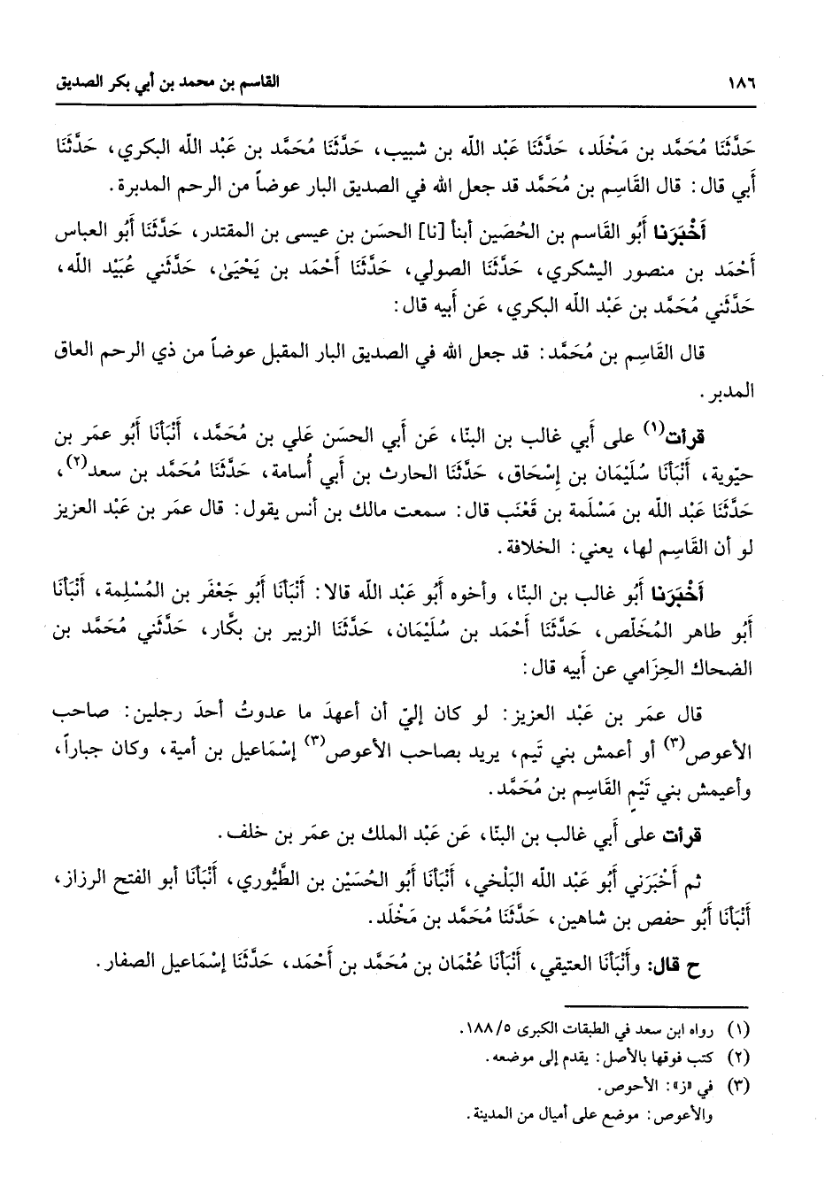 حدثنا محمد بن مخلد حدثنا عبد الله بن شبيب حدثنا محمد بن عبد الله البكري حدثنا أبي قال قال القاسم بن محمد قد جعل الله في الصديق البار عوضا من الرحم المدبرة أخبرنا أبو القاسم بن الحصين أبنأنا الحسن بن عيسى بن المقتدر حدثنا أبو العباس أحمد بن منصور اليشكري حدثنا الصولي حدثنا أحمد بن يحيى حدثني عبيد الله حدثني محمد بن عبد الله البكري عن أبيه قال قال القاسم بن محمد قد جعل الله في الصديق البار المقبل عوضا من ذي الرحم العاق المدبر قرأت (1) على أبي غالب بن البنا عن أبي الحسن علي بن محمد أنبانا أبو عمر بن حيوية أنبأنا سليمان بن إسحاق حدثنا الحارث بن أبي أسامة حدثنا محمد بن سعد (2) حدثنا عبد الله بن مسلمة بن قعنب قال سمعت مالك بن أنس يقول قال عمر بن عبد العزيز لو أن القاسم لها يعني الخلافة أخبرنا أبو غالب بن البنا وأخوه أبو عبد الله قالا أنبأنا أبو جعفر بن المسلمة أنبأنا أبو طاهر المخلص حدثنا أحمد بن سليمان حدثنا الزبير بن بكار حدثني محمد بن الضحاك الحزامي عن أبيه قال قال عمر بن عبد العزيز لو كان إلي أن أعهد ما عدوت أحد رجلين صاحب الأعوص (3) أو أعمش بني تيم يريد بصاحب الأعوص (3) إسماعيل بن أمية وكان جبارا وأعيمش بني تيم القاسم بن محمد قرأت على أبي غالب بن البنا عن عبد الملك بن عمر بن خلف ثم أخبرني أبو عبد الله البلخي أبنأنا أبو الحسين بن الطيوري أنبأنا أبو الفتح الرزاز أنبأنا أبو حفص بن شاهين حدثنا محمد بن مخلد قال وأنبأنا العتيقي أنبأنا عثمان بن محمد بن أحمد حدثنا إسماعيل الصفار