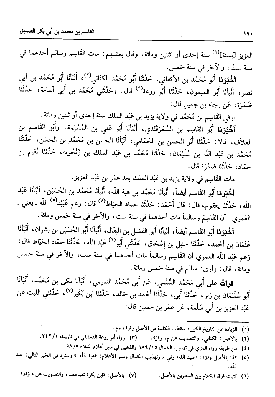 العزيز بسنة (1) سنة إحدى أو اثنتين ومائة وقال بعضهم مات القاسم وسالم أحدهما في سنت ست والآخر في سنة خمس أخبرنا أبو محمد بن الأكفاني حدثنا أبو محمد الكتاني (2) أنبأنا أبو محمد بن أبي نصر أنبأنا أبو الميمون حدثنا أبو زرعة (3) قال وحدثني محمد بن أبي أسامة حدثنا ضمرة عن رجاء بن جميل قال توفي القاسم بن محمد في ولاية يزيد بن عبد الملك سنة إحدى أو اثنتين ومائة أخبرنا أبو القاسم بن السمرقندي أنبأنا أبو علي بن المسلمة وأبو القاسم بن العلاف قالا حدثنا أبو الحسن بن الحمامي أنبأنا الحسن بن محمد بن الحسن حدثنا محمد بن عبد الله بن سليمان حدثنا محمد بن عبد الملك بن زنجوية حدثنا نعيم بن حماد حدثنا ضمرة قال مات القاسم في ولاية يزيد بن عبد الملك بعد عمر بن عبد العزيز أخبرنا أبو القاسم أيضا أنبأنا محمد بن هبة الله أنبأنا محمد بن الحسين أنبأنا عبد الله حدثنا يعقوب قال قال أحمد حدثنا حماد الخياط (4) قال زعم عبيد (5) الله يعني العمري أن القاسم وسالما مات أحدهما في سنة ست والآخر في سنة خمس ومائة أخبرنا أبو القاسم أيضا أنبأنا أبو الفضل بن البقال أبنأنا أبو الحسين بن بشران أنبأنا عثمان بن أحمد حدثنا حنبل بن إسحاق حدثني أبو (6) عبد الله حدثنا حماد الخياط قال زعم عبد الله العمري أن القاسم وسالما مات أحدهما في سنة ست والآخر في سنة خمس ومائة قال وأرى سالم في سنة خمس ومائة قرأت على أبي محمد السلمي عن أبي محمد التميمي أنبأنا مكي بن محمد أنبأنا أبو سليمان بن زبر حدثنا أبي حدثنا أحمد بن خالد حدثنا ابن بكير (7) حدثني الليث عن عبد العزيز بن أبي سلمة عن عمر بن حسين قال