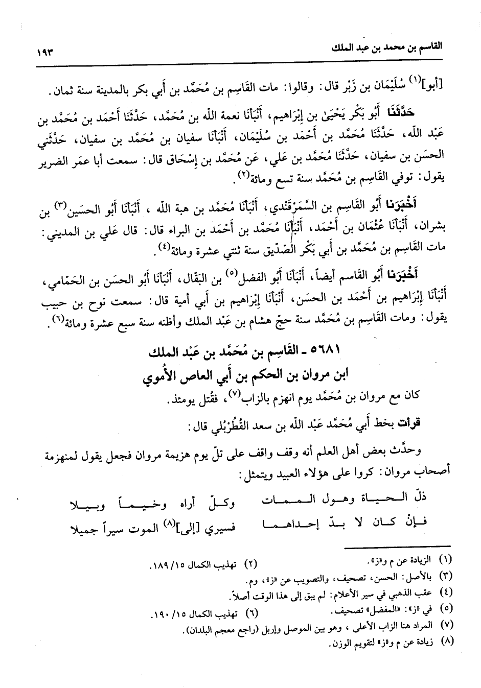 5681 - القاسم بن محمد بن عبد الملك ابن مروان بن الحكم بن أبي العاص الأموي كان مع مروان بن محمد يوم انهزم بالزاب (7) فقتل يومئذ قرأت بخط أبي محمد عبد الله بن سعد القطربلي قال وحدث بعض أهل العلم أنه وقف واقف على تل يوم هزيمة مروان فجعل يقول لمنهزمة أصحاب مروان كروا على هؤلاء العبيد ويتمثل * ذل الحياة وهول الممات * وكل أراه وخيما وبيلا فإن كان لا بد إحداهما * فسيري إلى (8) الموت سيرا جميلا