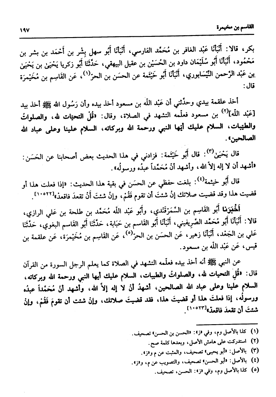 بكر قالا أنبأنا عبد الغافر بن محمد الفارسي أنبأنا أبو سهل بشر بن أحمد بن بشر بن محمود أنبأنا أبو سليمان داود بن الحسين بن عقيل البيهقي حدثنا أبو زكريا يحيى بن يحيى بن عبد الرحمن النيسابوري أنبأنا أبو خيثمة عن الحسن بن الحر (1) عن القاسم بن مخيمرة قال أخذ علقمة بيدي وحدثني أن عبد الله (2) بن مسعود أخذ بيده وأن رسول الله (صلى الله عليه وسلم) أخذ بيد عبد الله بن مسعود فعلمه التشهد في الصلاة وقال قل التحيات لله والصلوات والطيبات السلام عليك أيها النبي ورحمة الله وبركاته السلام علينا وعلى عباد الله الصالحين قال يحيى (3) قال أبو خيثمة فزادني في هذا الحديث بعض أصحابنا عن الحسن أشهد أن لا إله إلا الله وأشهد أن محمدا عبده ورسوله قال أبو خيثمة (4) بلغت حفظي عن الحسن في بقية هذا الحديث إذا فعلت هذا أو قضيت هذا وقد قضيت صلاتك إن شئت أن تقوم فقم وإن شئت أن تقعد فاقعد