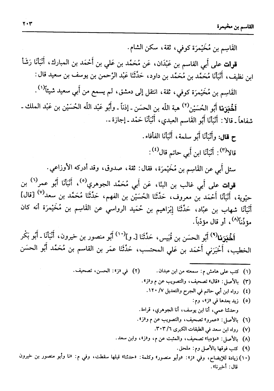 القاسم بن مخيمرة كوفي ثقة سكن الشام قرأت على أبي القاسم بن عبدان عن محمد بن علي بن أحمد بن المبارك أنبأنا رشأ ابن نظيف أنبأنا محمد بن محمد بن داود حدثنا عبد الرحمن بن يوسف بن سعيد قال القاسم بن مخيمرة كوفي ثقة انتقل إلى دمشق لم يسمع من أبي سعيد شيئا (1) أخبرنا أبو الحسين (2) هبة الله بن الحسن إذنا وأبو عبد الله الحسين بن عبد الملك شفاها قالا أنبأنا أبو القاسم العبدي أنبأنا حمد إجازة قال وأنبانا أبو سلمة أنبأنا الفأفاء قالا (3) أنبأنا ابن أبي حاتم قال (4) سئل أبي عن القاسم بن مخيمرة فقال ثقة صدوق وقد أدركه الأوزاعي قرأت على أبي غالب بن البنا عن أبي محمد الجوهري (5) أنبأنا أبو عمر (6) بن حيوية أنبأنا أحمد بن معروف حدثنا الحسين بن الفهم حدثنا محمد بن سعد (7) قال أنبأنا شهاب بن عباد حدثنا إبراهيم بن حميد الرواسي عن القاسم بن مخيمرة أنه كان مؤذنا (8) أو قال مؤدبا أخبرنا (9) أبو الحسن بن قبيس حدثنا و (10) أبو منصور بن خيرون أنبأنا أبو بكر الخطيب أخبرني أحمد بن علي المحتسب حدثنا عمر بن القاسم بن محمد أبو الحسن