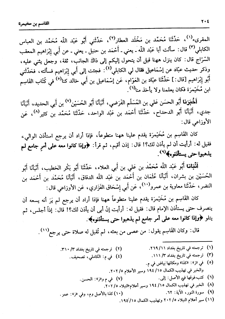 المقرئ (1) حدثنا محمد بن مخلد العطار (2) حدثني أبو عبد الله محمد بن العباس الكابلي (3) قال سألت أبا عبد الله يعني أحمد بن حنبل يعني عن أبي إبراهيم المعقب السراج قال كان ينزل ههنا قبل أن يتحول إليكم إلى ذاك الجانب ثقة وجعل يثني عليه وذكر حديث عباد عن إسماعيل فقال لي الكابلي (4) فجئت إلى أبي إبراهيم فسألته فحدثني أبو إبراهيم قال حدثنا عباد بن العوام عن إسماعيل بن أبي خالد كنا (5) في كتاب القاسم ابن مخيمرة فكان يعلمنا ولا يأخذ منا (6) أخبرنا أبو الحسن علي بن المسلم الفرضي أنبأنا أبو الحسين (7) بن أبي الحديد أنبأنا جدي أنبأنا أبو الدحداح حدثنا أحمد بن عبد الواحد حدثنا محمد بن كثير (8) عن الأوزاعي قال كان القاسم بن مخيمرة يقدم علينا ههنا متطوعا فإذا أراد أن يرجع استأذن الوالي فقيل له أرأيت أن لم يأذن لك قال إذن أقيم ثم قرأ " وإذا كانوا معه على أمر جامع لم يذهبوا حتى يستأذنوه " (9) أنبأنا أبو عبد الله محمد بن علي بن أبي العلاء حدثنا أبو بكر الخطيب أنبأنا أبو الحسين بن بشران أنبأنا عثمان بن أحمد بن عبد الله الدقاق أنبأنا محمد بن أحمد بن النضر حدثنا معاوية بن عمرو (10) عن أبي إسحاق الفزاري عن الأوزاعي قال كان القاسم بن مخيمرة يقدم علينا متطوعا ههنا فإذا أراد أن يرجع لم ير أنه يسعه أن ينصرف حتى يستأذن الإمام قال فقيل له أرأيت إن أبى أن يأذن لك قال إذا أجلس ثم يتلو " وإذا كانوا معه على أمر جامع لم يذهبوا حتى يستأذنوه " قال وكان القاسم يقول من عصى من بعثه لم تقبل له صلاة حتى يرجع (11)