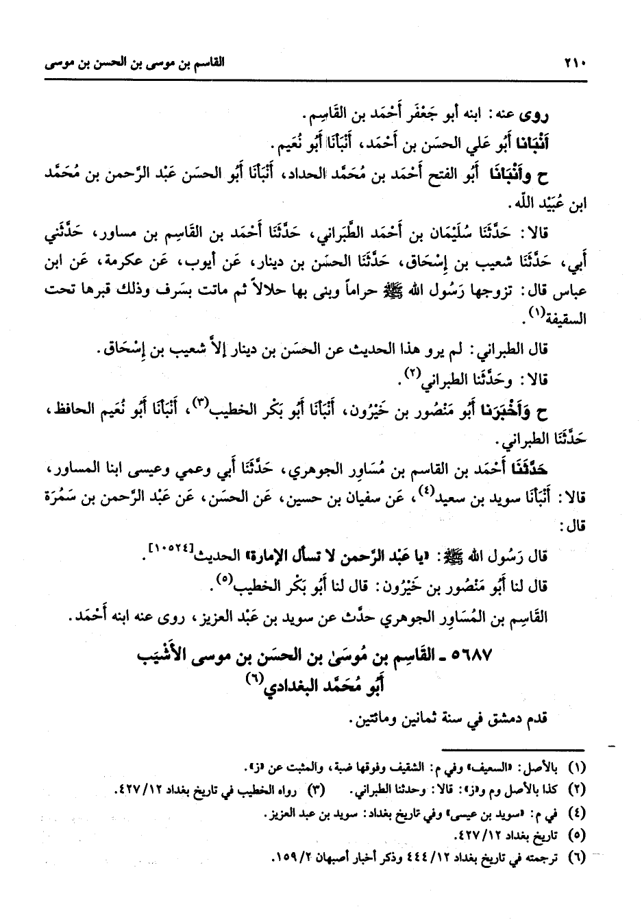 5687 - القاسم بن موسى بن الحسن بن موسى الأشيب أبو محمد البغدادي (6) قدم دمشق في سنة ثمانين ومائتين