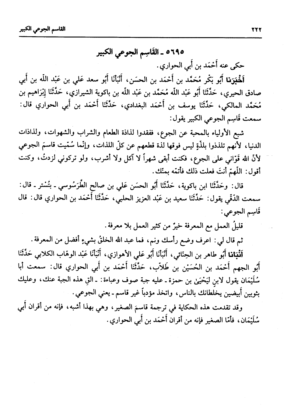 5695 - القاسم الجوعي الكبير حكى عنه أحمد بن أبي الحواري أخبرنا أبو بكر محمد بن أحمد بن الحسن أنبأنا أبو سعد علي بن عبد الله بن أبي صادق الحيري حدثنا أبو عبد الله محمد بن عبد الله بن باكوية الشيرازي حدثنا إبراهيم بن محمد المالكي حدثنا يوسف بن أحمد البغدادي حدثنا أحمد بن أبي الحواري قال سمعت قاسم الجوعي الكبير يقول شبع الأولياء بالمحبة عن الجوع ففقدوا لذاذة الطعام والشراب والشهوات ولذاذات الدنيا لأنهم تلذذوا بلذة ليس فوقها لذة قطعهم عن كل اللذات وإنما سميت قاسم الجوعي لأن الله قواني على الجوع فكنت أبقى شهرا لا آكل ولا أشرب ولو تركوني لزدت وكنت أقول اللهم أنت فعلت ذلك فأتمه بمنك قال وحدثنا ابن باكوية حدثنا أبو الحسن علي بن صالح الطرسوسي بتستر قال سمعت الدقي يقول حدثنا سعيد بن عبد العزيز الحلبي حدثنا أحمد بن الحواري قال قال قاسم الجوعي قليل العمل مع المعرفة خير من كثير العمل بلا معرفة ثم قال لي اعرف وضع رأسك ونم فما عبد الله الخلق بشئ أفضل من المعرفة أنبأنا أبو طاهر بن الحنائي أنبأنا أبو علي الأهوازي أنبأنا عبد الوهاب الكلابي حدثنا أبو الجهم أحمد بن الحسين بن طلاب حدثنا أحمد بن أبي الحواري قال سمعت أبا سليمان يقول لابن ليحيى بن حمزة عليه جبة صوف وعباءة الق هذه الجبة عنك وعليك بثوبين أبيضين يخلطانك بالناس واتخذ مؤدبا غير قاسم يعني الجوعي وقد تقدمت هذه الحكاية في ترجمة قاسم الصغير وهي بهذا أشبه فإنه من أقران أبي سليمان فأما الصغير فإنه من أقران أحمد بن أبي الحواري