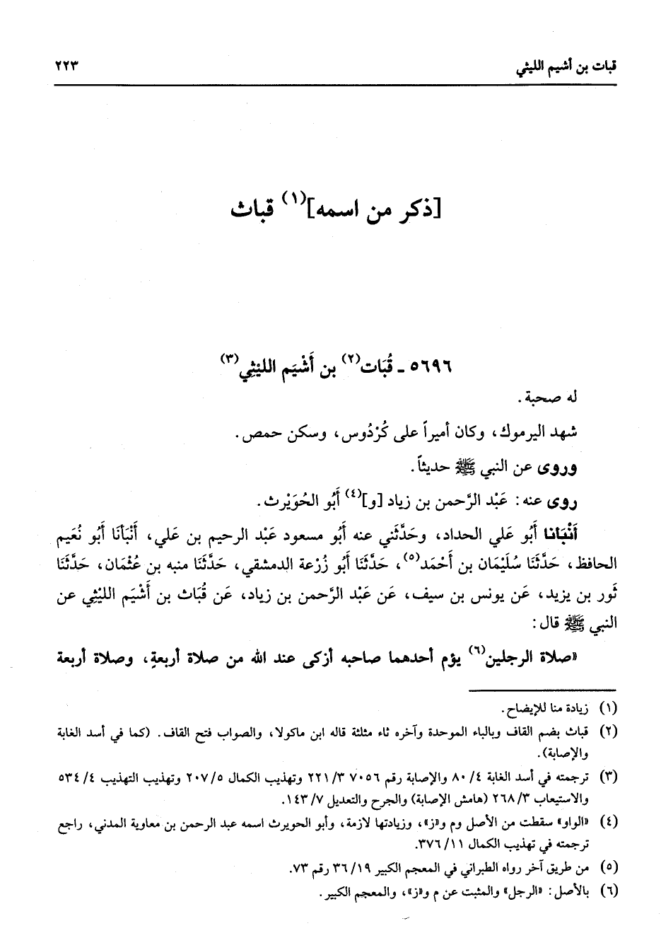 5696 - قبات (2) بن أشيم الليثي (3) له صحبة شهد اليرموك وكان أميرا على كردوس وسكن حمص وروى عن النبي (صلى الله عليه وسلم) حديثا روى عنه عبد الرحمن بن زياد و (4) أبو الحويرث أنبأنا أبو علي الحداد وحدثني عنه أبو مسعود عبد الرحيم بن علي أنبأنا أبو نعيم الحافظ حدثنا سليمان بن أحمد (5) حدثنا أبو زرعة الدمشقي حدثنا منبه بن عثمان حدثنا ثور بن يزيد عن يونس بن سيف عن عبد الرحمن بن زياد عن قباث بن أشيم الليثي عن النبي (صلى الله عليه وسلم) قال صلاة الرجلين (6) يؤم أحدهما صاحبه أزكى عند الله من صلاة أربعة وصلاة أربعة