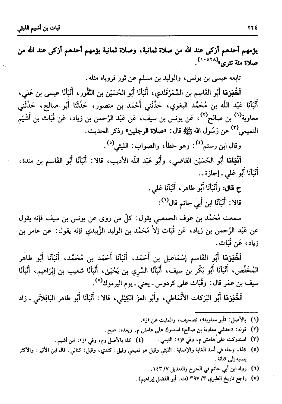 [10528] تابعه عيسى بن يونس والوليد بن مسلم عن ثور فروياه مثله أخبرنا أبو القاسم بن السمرقندي أنبأنا أبو الحسين بن النقور أنبأنا عيسى بن علي أنبأنا عبد الله بن محمد البغوي حدثني أحمد بن منصور حدثنا أبو صالح حدثني معاوية (1) بن صالح (2) عن يونس بن سيف عن عبد الرحمن بن زياد عن قباث بن أشيم التميمي (3) عن رسول الله (صلى الله عليه وسلم) قال صلاة الرجلين وذكر الحديث وقال ابن رستم (4) وهو خطأ والصواب الليثي (5) أنبأنا أبو الحسين القاضي وأبو عبد الله الأديب قالا أنبأنا أبو القاسم بن مندة أنبأنا أبو علي إجازة قال وأنبأنا أبو طاهر أنبأنا علي قالا أنبأنا ابن أبي حاتم قال (6) سمعت محمد بن عوف الحمصي يقول كل من روى عن يونس بن سيف فإنه يقول عن عبد الرحمن بن زياد عن قباث إلا محمد بن الوليد الزبيدي فإنه يقول عن عامر بن زياد عن قباث أخبرنا أبو القاسم إسماعيل بن أحمد أنبأنا أحمد بن محمد أنبأنا أبو طاهر المخلص أنبأنا أبو بكر بن سيف أنبأنا السري بن يحيى أنبأنا شعيب بن إبراهيم أنبأنا سيف بن عمر قال وقباث على كردوس يعني يوم اليرموك (7) أخبرنا أبو البركات الأنماطي وأبو العز الكيلي قالا أنبأنا أبو طاهر الباقلاني زاد