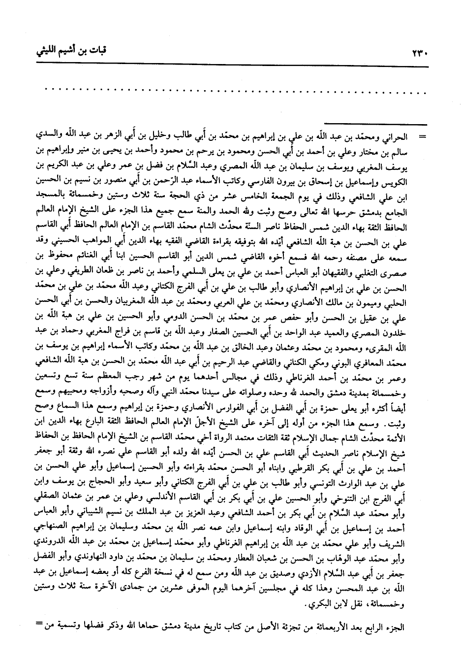 - الحراني ومحمد بن عبد الله بن علي بن إبراهيم بن محمد بن أبي طالب وخليل بن أبي الزهر بن عبد الله والسدي سالم بن مختار وعلي بن أحمد بن أبي الحسن ومحمود بن يرحم بن محمود وأحمد بن ييى بن منير وإبراهيم بن يوسف المغربي ويوسف بن سليمان بن عبد الله المصري وعبد السلام بن فضل بن عمر وعلي بن عبد الكريم بن الكويس وإسماعيل بن إسحاق بن بيرون الفارسي وكاتب الاسماء عبد الرحمن بن أبي منصور بن نسيم بن الحسين ابن علي الشافعي وذلك في يوم الجمعة الخامس عشر من ذي الحجة سنة ثلاث وستين وخمسمائة بالمسجد الجامع بدمشق رسها الله تعالى وصح وثبت ولله الحمد والمنة سمع جميع هذا الجزء على الشيخ الامام العالم الحافظ الثقة بهاء الدين شمس الحفاظ ناصر السنة محدث الشام محمد القاسم بن الامام العالم الحافظ أبي القاسم علي بن الحسن بن هبة الله الشافعي أيده الله بتوفيقه بقراءة القاضي الفقيه بهاء الدين أبي المواهب الحسيني وقد سمعه على مصنفه رحمه الله فسمع أخوه القاضي شمس الدين أبو القاسم الحسين ابنا أبي الغنائم محفوظ بن صصرى التغلبي والفقيهان أبو العباس أحمد بن علي بن يعلى السلمي وأحمد بن ناصر بن ظعان الطريفي وعلي بن الحسن بن علي بن إبراهيم الانصاري وأبو طالب بن علي بن أبي الفرج الكتاني وعبد الله محمد بن علي بن محمد الحلبي وميمون بن مالك الانصاري ومحمد بن علي العربي ومحمد بن عبد الله المغربيان والحسن بن أبي الحسن علي بن عقيل بن الحسن وأبو حفص عمر بن محمد بن الحسن الدومي وأبو الحسين بن علي بن هبة الله بن خلدون المصري والعميد عبد الواحد بن أبي الحسين الصفار وعبد الله بن قاسم بن فراج المغربي وحماد بن عبد محمد المعافري البوني ومكي الكناني والقاضي عبد الرحيم بن أبي عبد الله محمد بن الحسن بن هبة الله الشافعي وعمر بن محمد بن أحمد الغرناطي وذلك في مجالس أحدهما يوم من شهر رجب المعظم سنة تسع وتسعين وخمسمائة بمدينة دمشق والحمد لله وحده وصلواته على سيدنا محمد النبي وآله وصحبه وأزواجه ومحبيهم وسمع أيضا أكثره أبو يعلى حمزة بن أبي الفضل بن أبي الفوارس الانصاري وحمزة بن إبراهيم وسمع هذا السماع وصح وثبت