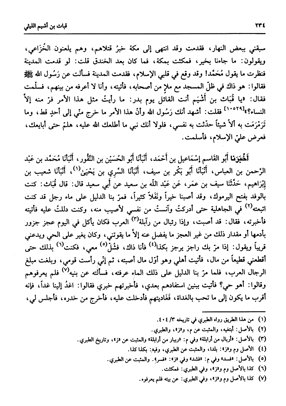 [10529] فقلت أشهد أنك رسول الله وأن هذا الأمر ما خرج مني إلى أحد قط وما ترمرمت به إلا شيئا حدثت به نفسي فلولا أنك نبي ما أطلعك الله عليه هلم حتى أبايعك فعرض علي الإسلام فأسلمت أخبرنا أبو القاسم إسماعيل بن أحمد أنبأنا أبو الحسين بن النقور أنبأنا محمد بن عبد الرحمن بن العباس أنبأنا أبو بكر بن سيف أنبأنا السري بن يحيى (1) أنبأنا شعيب بن إبراهيم حدثنا سيف بن عمر عن عبد الله بن سعيد عن أبي سعيد قال قال قباث كنت بالوفد بفتح اليرموك وقد أصبنا خيرا ونفلا كثيرا فمر بنا الدليل على ماء رجل قد كنت اتبعته (2) في الجاهلية حتى أدركت وآنست من نفسي لأصيب منه وكنت دللت عليه فأتيته فأخبرته فقال قد أصبت وإذا رئبال من رآبلة (3) العرب فكان يأكل في اليوم عجز جزور بأدمها أو مقدار ذلك من غير العجز ما يفضل عنه إلا ما يقوتني وكان يغير على الحي ويدعني قريبا ويقول إذا مر بك راجز يرجز بكذا (4) فأنا ذاك فشل (5) معي فكنت (6) بذلك حتى أقطعني قطيعا من مال فأتيت أهلي وهو أول مال أصبته ثم إني رأست قومي وبلغت مبلغ الرجال العرب فلما مر بنا الدليل على ذلك الماء عرفته فسألته عن بنيه (7) فلم يعرفوهم وقالوا أهو حي فأتيت ببنين استفادهم بعدي فأخبرتهم خبري فقالوا اغد إلينا غدا فإنه أقرب ما يكون إلى ما تحب بالغداة فغاديتهم فأدخلت عليه فأخرج من خدره فأجلس لي