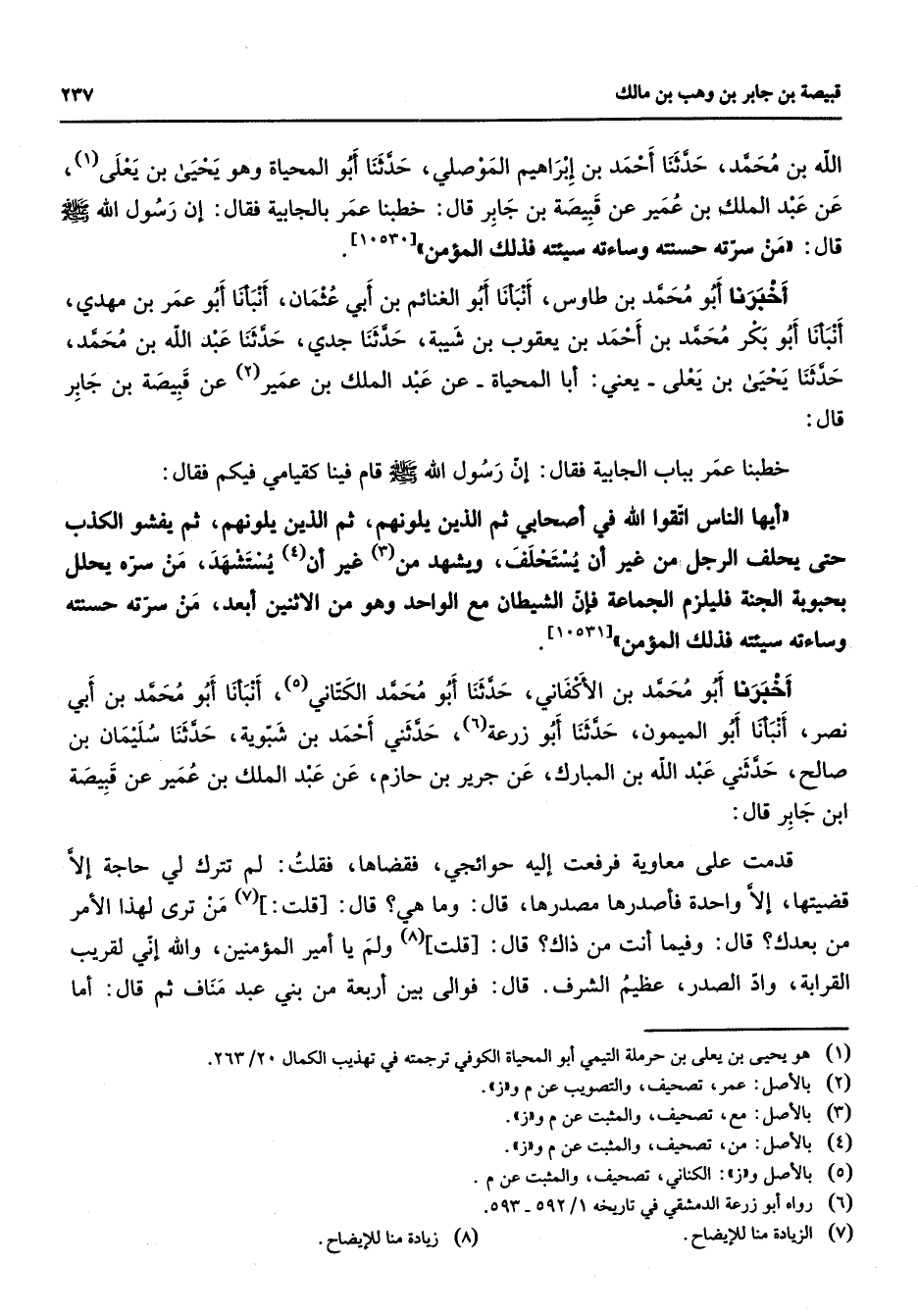 الله بن محمد حدثنا أحمد بن إبراهيم الموصلي حدثنا أبو المحياة وهو يحيى بن يعلى (1) عن عبد الملك بن عمير عن قبيصة بن جابر قال خطبنا عمر بالجابية فقال إن رسول الله (صلى الله عليه وسلم) قال من سرته حسنته وساءته سيئته فذلك المؤمن
