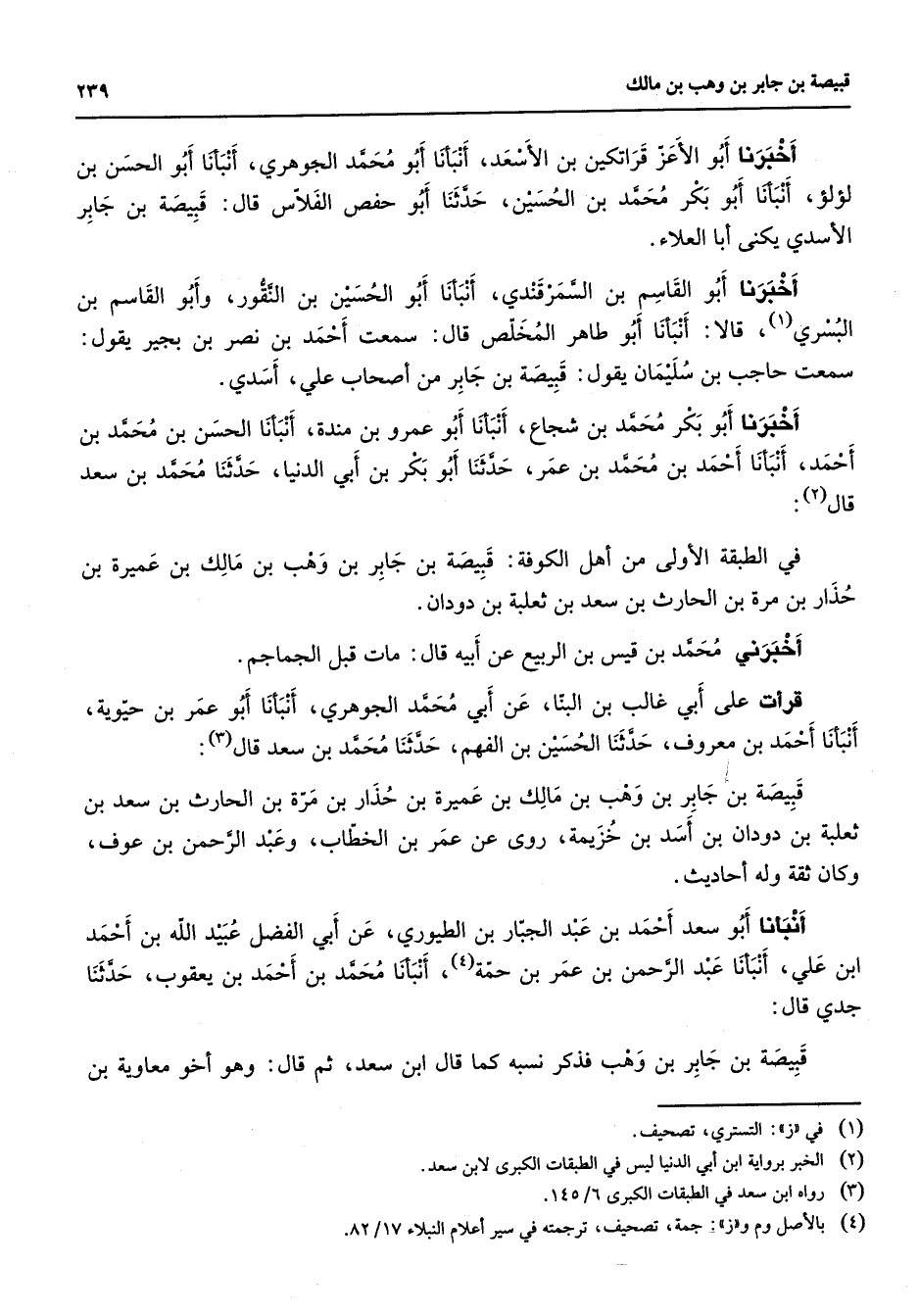 أخبرنا أبو الأعز قراتكين بن الأسعد أنبأنا أبو محمد الجوهري أنبأنا أبو الحسن بن لؤلؤ أنبأنا أبو بكر محمد بن الحسين حدثنا أبو حفص الفلاس قال قبيصة بن جابر الأسدي يكنى أبا العلاء أخبرنا أبو القاسم بن السمرقندي أنبأنا أبو الحسين بن النقور وأبو القاسم بن البسري (1) قالا أنبأنا أبو طاهر المخلص قال سمعت أحمد بن نصر بن بجير يقول سمعت حاجب بن سليمان يقول قبيصة بن جابر من أصحاب علي أسدي أخبرنا أبو بكر محمد بن شجاع أنبأنا أبو عمرو بن مندة أنبأنا الحسن بن محمد بن أحمد أنبأنا أحمد بن محمد بن عمر حدثنا أبو بكر بن أبي الدنيا حدثنا محمد بن سعد قال (2) في الطبقة الأولى من أهل الكوفة قبيصة بن جابر بن وهب بن مالك بن عميرة بن حذار بن مرة بن الحارث بن سعد بن ثعلبة بن دودان أخبرني محمد بن قيس بن الربيع عن أبيه قال مات قبل الجماجم قرأت على أبي غالب بن البنا عن أبي محمد الجوهري أنبأنا أبو عمر بن حيوية أنبأنا أحمد بن معروف حدثنا الحسين بن الفهم حدثنا محمد بن سعد قال (3) قبيصة بن جابر بن وهب بن مالك بن عميرة بن حذار بن مرة بن الحارث بن سعد بن ثعلبة بن دودان بن أسد بن خزيمة روى عن عمر بن الخطاب وعبد الرحمن بن عوف وكان ثقة وله أحاديث أنبأنا أبو سعد أحمد بن عبد الجبار بن الطيوري عن أبي الفضل عبيد الله بن أحمد ابن علي أنبأنا عبد الرحمن بن عمر بن حمة (4) أنبأنا محمد بن أحمد بن يعقوب حدثنا جدي قال قبيصة بن جابر بن وهب فذكر نسبه كما قال ابن سعد ثم قال وهو أخو معاوية بن