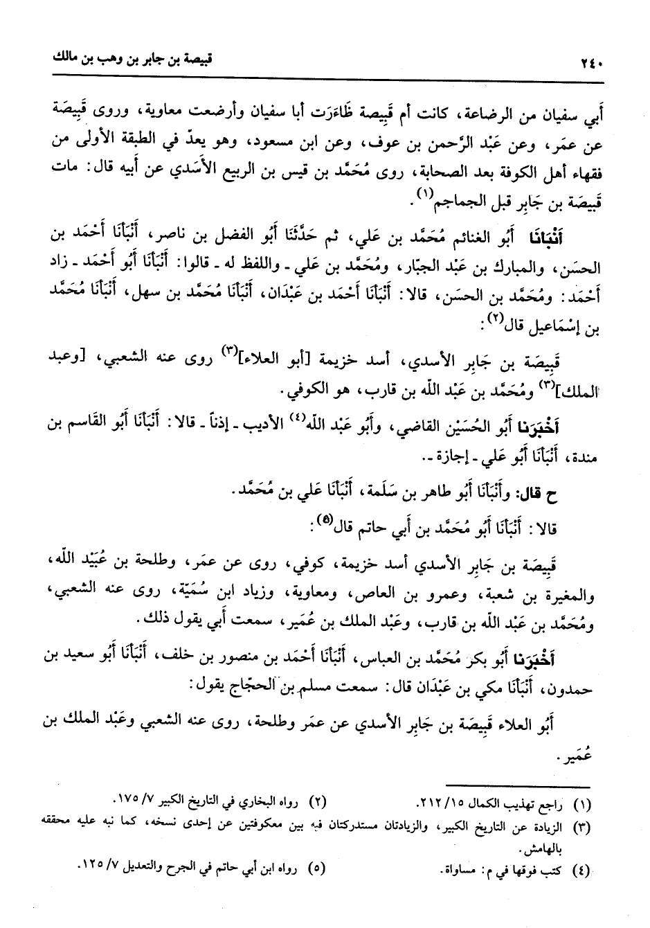 أبي سفيان من الرضاعة كانت أم قبيصة ظاءرت أبا سفيان وأرضعت معاوية وروى قبيصة عن عمر وعن عبد الرحمن بن عوف وعن ابن مسعود وهو يعد في الطبقة الأولى من فقهاء أهل الكوفة بعد الصحابة روى محمد بن قيس بن الربيع الأسدي عن أبيه قال مات قبيصة بن جابر قبل الجماجم (1) أنبأنا أبو الغنائم محمد بن علي ثم حدثنا أبو الفضل بن ناصر أنبأنا أحمد بن الحسن والمبارك بن عبد الجبار ومحمد بن علي واللفظ له قالوا أنبأنا أبو أحمد زاد أحمد ومحمد بن الحسن قالا أنبأنا أحمد بن عبدان أنبأنا محمد بن سهل أنبأنا محمد بن إسماعيل قال (2) قبيصة بن جابر الأسدي أسد خزيمة أبو العلاء (3) روى عنه الشعبي وعبد الملك (3) ومحمد بن عبد الله بن قارب هو الكوفي أخبرنا أبو الحسين القاضي وأبو عبد الله (4) الأديب إذنا قالا أنبأنا أبو القاسم بن مندة أنبأنا أبو علي إجازة قال وأنبأنا أبو طاهر بن سلمة أنبأنا علي بن محمد قالا أنبأنا أبو محمد بن أبي حاتم قال (5) قبيصة بن جابر الأسدي أسد خزيمة كوفي روى عن عمر وطلحة بن عبيد الله والمغيرة بن شعبة وعمرو بن العاص ومعاوية وزياد ابن سمية روى عنه الشعبي ومحمد بن عبد الله بن قارب وعبد الملك بن عمير سمعت أبي يقول ذلك أخبرنا أبو بكر محمد بن العباس أنبأنا أحمد بن منصور بن خلف أنبأنا أبو سعيد بن حمدون أنبأنا مكي بن عبدان قال سمعت مسلم بن الحجاج يقول أبو العلاء قبيصة بن جابر الأسدي عن عمر وطلحة روى عنه الشعبي وعبد الملك بن عمير