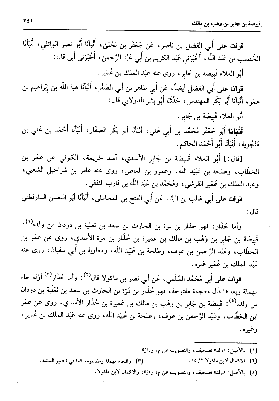 قرأت على أبي الفضل بن ناصر عن جعفر بن يحيى أنبأنا أبو نصر الوائلي أنبأنا الخصيب بن عبد الله أخبرني عبد الكريم بن أبي عبد الرحمن أخبرني أبي قال أبو العلاء قبيصة بن جابر روى عنه عبد الملك بن عمير قرأنا على أبي الفضل أيضا عن أبي طاهر بن أبي الصقر أنبأنا هبة الله بن إبراهيم بن عمر أنبأنا أبو بكر المهندس حدثنا أبو بشر الدولابي قال أبو العلاء قبيصة بن جابر أنبأنا أبو جعفر محمد بن أبي علي أنبأنا أبو بكر الصفار أنبأنا أحمد بن علي بن منجوية أنبأنا أبو أحمد الحاكم قال أبو العلاء قبيصة بن جابر الأسدي أسد خزيمة الكوفي عن عمر بن الخطاب وطلحة بن عبيد الله وعمرو بن العاص روى عنه عامر بن شراحيل الشعبي وعبد الملك بن عمير القرشي ومحمد بن عبد الله بن قارب الثقفي قرأت على أبي غالب بن البنا عن أبي الفتح بن المحاملي أنبأنا أبو الحسن الدارقطني قال وأما حذار فهو حذار بن مرة بن الحارث بن سعد بن ثعلبة بن دودان من ولده (1) قبيصة بن جابر بن وهب بن مالك بن عميرة بن حذار بن مرة الأسدي روى عن عمر بن الخطاب وعبد الرحمن بن عوف وطلحة بن عبيد الله ومعاوية بن أبي سفيان روى عنه عبد الملك بن عمير غيره قرأت على أبي محمد السلمي عن أبي نصر بن ماكولا قال (2) وأما حذار (3) أوله حاء مهملة وبعدها ذال معجمة مفتوحة فهو حذار بن مرة بن الحارث بن سعد بن ثعلبة بن دودان من ولده (4) قبيصة بن جابر بن وهب بن مالك بن عميرة بن حذار الأسدي روى عن عمر بن الخطاب وعبد الرحمن بن عوف وطلحة بن عبيد الله روى عنه عبد الملك بن عمير وغيره