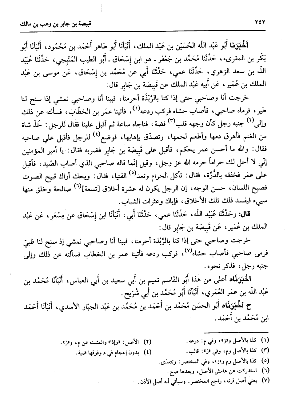 أخبرنا أبو عبد الله الحسين بن عبد الملك أنبأنا أبو طاهر أحمد بن محمود أنبأنا أبو بكر بن المقرئ حدثنا محمد بن جعفر هو ابن إسحاق أبو الطيب المنبجي حدثنا عبيد الله بن سعد الزهري حدثنا عمي حدثنا أبي عن محمد بن إسحاق عن موسى بن عبد الملك بن عمير عن أبيه عبد الملك عن قبيصة بن جابر قال خرجت أنا وصاحبي حتى إذا كنا بالربذة أحرمنا فبينا أنا وصاحبي نمشي إذا سنح لنا طير فرماه صاحبي فأصاب حشاه فركب ردعه (1) فأتينا عمر بن الخطاب فسألته عن ذلك وإلى (2) جنبه رجل كأن وجهه قلب (3) فضة فناجاه ساعة ثم أقبل علينا فقال للرجل خذ شاة من الغنم فأهرق دمها وأطعم لحمها وتصدق بإهابها فوضع (4) للرجل فأقبل علي صاحبه فقال والله ما أحسن عمر يحكم فأقبل على قبيصة بن جابر فضربه فقال يا امير المؤمنين إني لا أحل لك حراما حرمه الله عز وجل وقيل إنما قاله صاحبي الذي اصاب الصيد فأقبل على عمر فخفقه بالدرة فقال تأكل الحرام وتعد (5) الفتيا فقال ويحك أراك قبيح الصوت فصيح اللسان حسن الوجه إن الرجل يكون له عشرة أخلاق تسعة (6) صالحة وخلق منها سيئ فيفسد ذلك تلك الأخلاق فإياك وعثرات الشباب قال وحدثنا عبيد الله حدثنا عمي حدثنا أبي أنبأنا ابن إسحاق عن مسعر عن عبد الملك بن عمير عن قبيصة بن جابر قال خرجت وصاحبي حتى إذا كنا بالربذة أحرمنا فبينا أنا وصاحبي نمشي إذ سنح لنا ظبي فرمى صاحبي فأصاب حشاه (7) فركب ردعه فأتينا عمر بن الخطاب فسألته عن ذلك وإلى جنبه رجل فذكر نحوه أخبرناه أعلى من هذا أبو القاسم تميم بن أبي سعيد بن أبي العاص أنبأنا محمد بن عبد الله بن عمر العمري أنبأنا أبو محمد بن أبي شريح أخبرناه أبو الحسن محمد بن أحمد بن محمد بن عبد الجبار الأسدي أنبأنا أحمد ابن محمد بن أحمد
