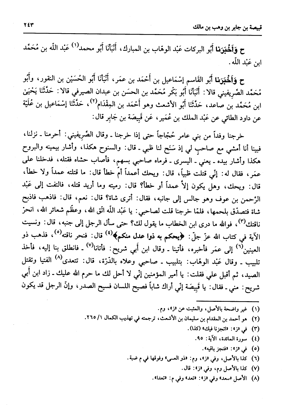 وأخبرنا أبو البركات عبد الوهاب بن المبارك أنبأنا أبو محمد عبد الله بن محمد ابن عبد الله وأخبرنا أبو القاسم إسماعيل بن أحمد بن عمر أنبأنا أبو الحسين بن النقور وأبو محمد الصريفيني قالا أنبأنا أبو بكر محمد بن الحسن بن عبدان الصيرفي قالا حدثنا يحيى ابن محمد بن صاعد حدثنا أبو الأشعث وهو أحمد بن المقدام (2) حدثنا إسماعيل بن علية عن داود الطائي عن عبد الملك بن عمير عن قبيصة بن جابر قال خرجنا وفدا من بني عامر حجاجا حتى إذا خرجنا وقال الصريفيني أحرمنا نزلنا فبينا أنا أمشي مع صاحب لي إذ سنح لنا ظبي قال والسنوح هكذا وأشار بيمينه والبروح هكذا وأشار بيده يعني اليسرى فرماه صاحبي بسهم فأصاب حشاه فقتله فدخلنا على عمر فقال له إني قتلت ظبيا قال ويحك أعمدا أم خطأ قال ما قتلته عمدا ولا خطأ قال ويحك وهل يكون إلا عمدا أو خطأ قال رميته وما أريد قتله فالتفت إلى عبد الرحمن بن عوف وهو جالس إلى جانبه فقال أترى شاة قال نعم قال فاذهب فاذبح شاة فتصدق بلحمها فلما خرجنا قلت لصاحبي يا عبد الله اتق الله وعظم شعائر الله انحر ناقتك (3) فوالله ما درى ابن الخطاب ما يقول لك حتى سأل الرجل إلى جنبه قال ونسيت الآية في كتاب الله عز وجل " يحكم به ذوا عدل منكم " (4) قال فنحر ناقته (5) فذهب ذو العينين (6) إلى عمر فأخبره فأتينا وقال ابن ابي شريح فأتانا (7) فانطلق بنا إليه فأخذ تلبيب وقال عبد الوهاب بتلبيب صاحبي وعلاه بالدرة قال تتعدى (8) الفتيا وتقتل الصيد ثم أقبل علي فقلت يا أمير المؤمنين إني لا أحل لك ما حرم الله عليك زاد ابن أبي شريح مني فقال يا قبيصة إني أراك شابا فصيح اللسان فسيح الصدر وإن الرجل قد يكون