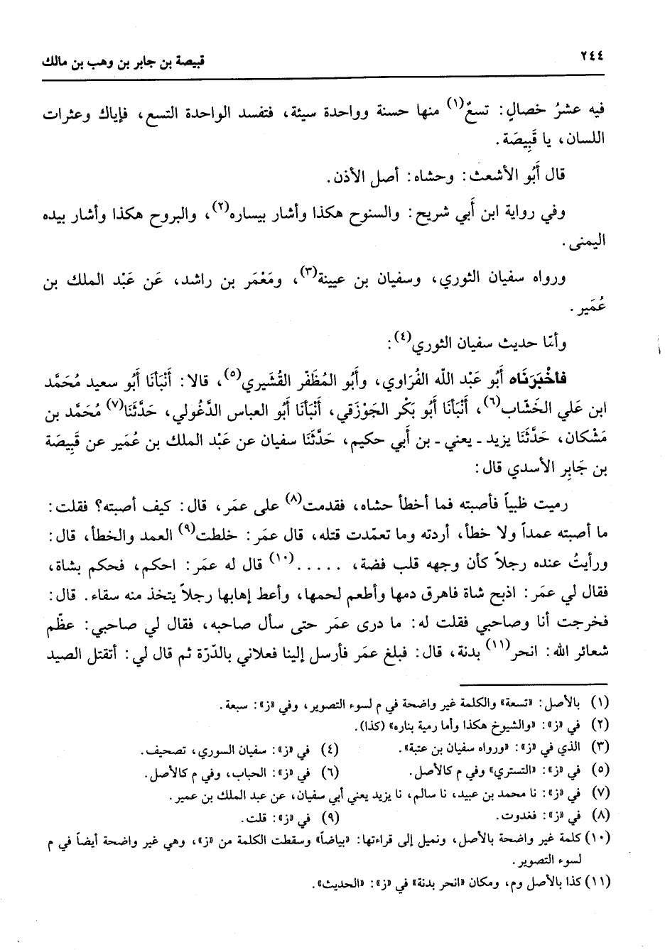فيه عشر خصال تسع (1) منها حسنة وواحدة سيئة فتفسد الواحدة التسع فإياك وعشرات اللسان يا قبيصة قال أبو الأشعث وحشاه أصل الأذن وفي رواية ابن أبي شريح والسنوح هكذا وأشار بيساره (2) والبروح هكذا وأشار بيده اليمنى ورواه سفيان الثوري وسفيان بن عيينة (3) ومعمر بن راشد عن عبد الملك بن عمير وأما حديث سفيان الثوري (4) فأخبرناه أبو عبد الله الفراوي وأبو المظفر القشيري (5) قالا أنبأنا أبو سعيد محمد ابن علي الخشاب (6) أنبأنا أبو بكر الجوزقي أنبأنا أبو العباس الدغولي حدثنا (7) محمد بن مشكان حدثنا يزيد يعني بن أبي حكيم حدثنا سفيان عن عبد الملك بن عمير عن قبيصة بن جابر الأسدي قال رميت ظبيا فأصبته فما أخطأ حشاه فقدمت (8) على عمر قال كيف أصبته فقلت ما أصبته عمدا ولا خطأ أردته وما تعمدت قتله قال عمر خلطت (9) العمد والخطأ قال ورأيت عنده رجلا كأن وجهه قلب فضة (10) قال له عمر احكم فحكم بشاة فقال لي عمر اذبح شاة فاهرق دمها وأطعم لحمها وأعط إهابها رجلا يتخذ منه سقاء قال فخرجت أنا وصاحبي فقلت له ما درى عمر حتى سأل صاحبه فقال لي صاحبي عظم شعائر الله انحر (11) بدنة قال فبلغ عمر فأرسل إلينا فعلاني بالدرة ثم قال لي أتقتل الصيد