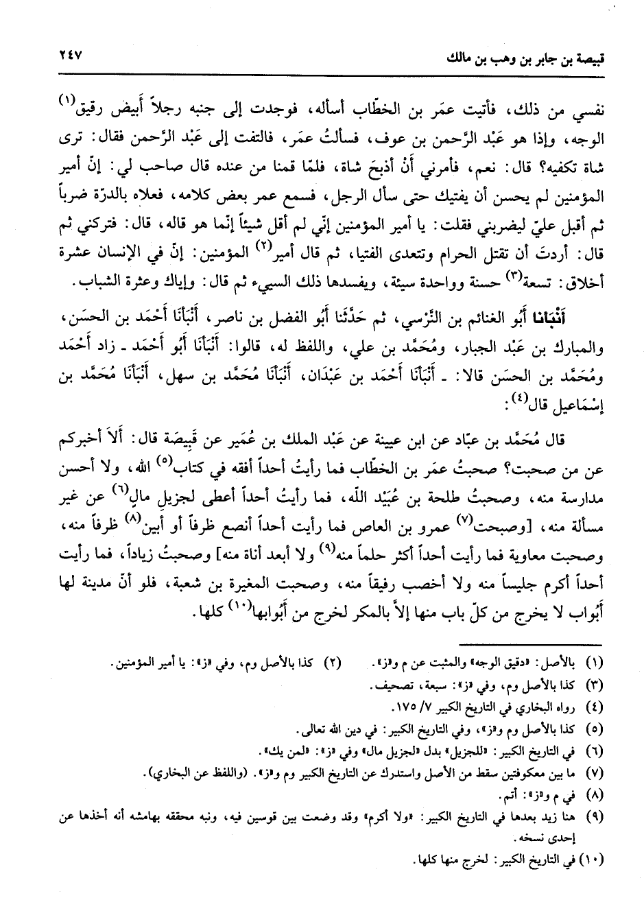 نفسي من ذلك فأتيت عمر بن الخطاب أسأله فوجدت إلى جنبه رجلا أبيض رقيق (1) الوجه وإذا هو عبد الرحمن بن عوف فسألت عمر فالتفت إلى عبد الرحمن فقال ترى شاة تكفيه قال نعم فأمرني أن أذبح شاة فلما قمنا من عنده قال صاحب لي إن أمير المؤمنين لم يحسن أن يفتيك حتى سأل الرجل فسمع عمر بعض كلامه فعلاه بالدرة ضربا ثم أقبل علي ليضربني فقلت يا أمير المؤمنين إني لم أقل شيئا إنما هو قاله قال فتركني ثم قال أردت أن تقتل الحرام وتتعدى الفتيا ثم قال أمير (2) المؤمنين إن في الإنسان عشرة أخلاق تسعة (3) حسنة وواحدة سيئة ويفسدها ذلك السئ ثم قال وإياك وعثرة الشباب أنبأنا أبو الغنائم بن النرسي ثم حدثنا أبو الفضل بن ناصر أنبأنا أحمد بن الحسن والمبارك بن عبد الجبار ومحمد بن علي واللفظ له قالوا أنبأنا أبو أحمد زاد أحمد ومحمد بن الحسن قالا أنبانا أحمد بن عبدان أنبانا محمد بن سهل أنبانا محمد بن إسماعيل قال (4) قال محمد بن عباد عن ابن عيينة عن عبد الملك بن عمير عن قبيصة قال ألا أخبركم عن من صحبت عمر بن الخطاب فما رأيت أحدا أفقه في كتاب (5) الله ولا أحسن مدارسة منه وصحبت طلحة بن عبيد الله فما رأيت أحدا أعطى لجزيل مال (6) عن غير مسألة منه وصحبت (7) عمرو بن العاص فما رأيت أحدا أنصع ظرفا أو أبين (8) ظرفا منه وصحبت معاوية فما رأيت أحدا أكثر حلما منه (9) ولا أبعد أناة منه وصحبت زيادا فما رأيت أحدا أكرم جليسا منه ولا أخصب رفيقا منه وصحبت المغيرة بن شعبة فلو أن مدينة لها أبواب لا يخرج من كل باب منها إلا بالمكر لخرج من أبوابها كلها