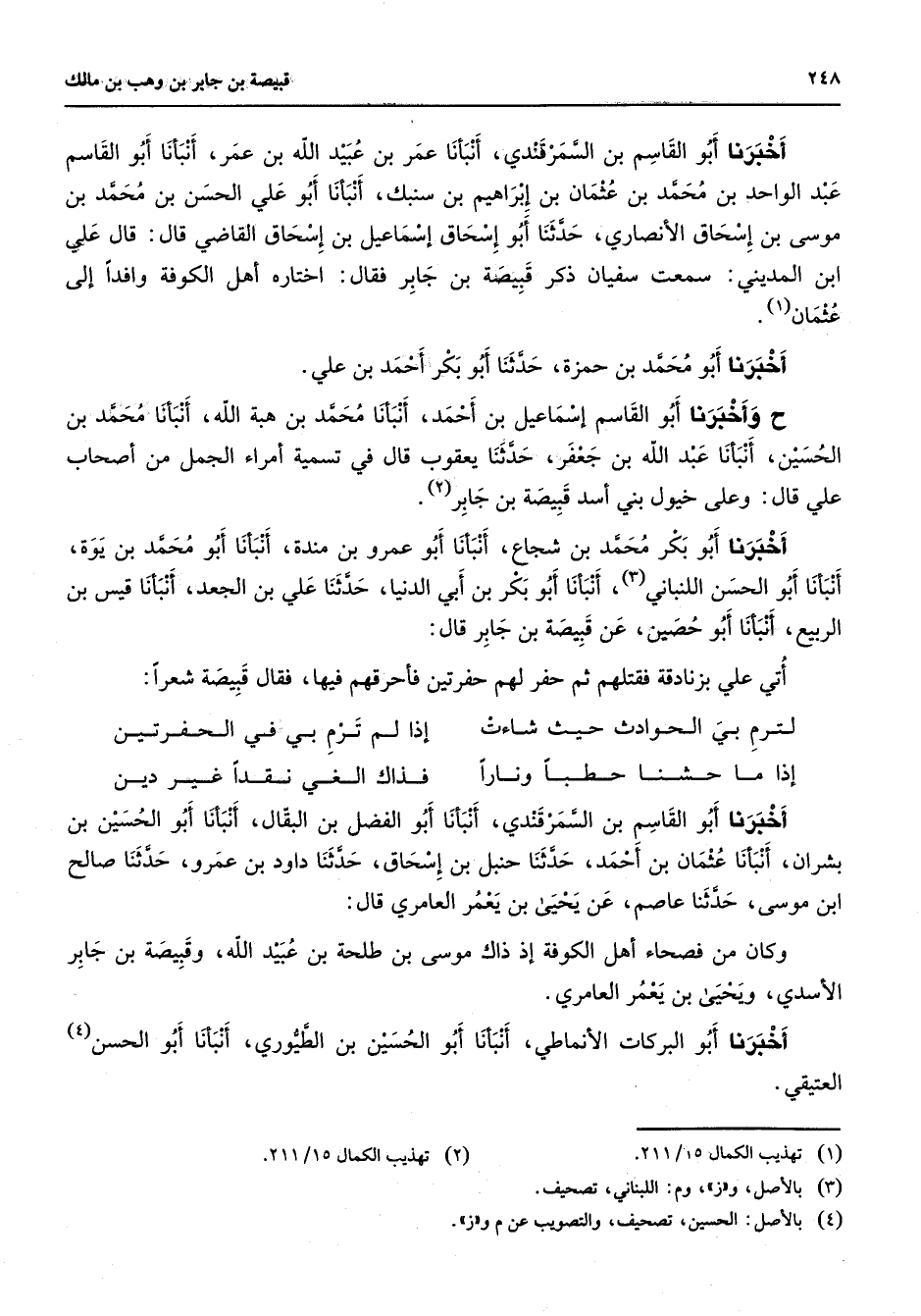 أخبرنا أبو القاسم بن السمرقندي أنبأنا عمر بن عبيد الله بن عمر أنبأنا أبو القاسم عبد الواحد بن محمد بن عثمان بن إبراهيم بن سنبك أنبأنا أبو علي الحسن بن محمد بن موسى بن إسحاق الأنصاري حدثنا أبو إسحاق إسماعيل بن إسحاق القاضي قال قال علي ابن المديني سمعت سفيان ذكر قبيصة بن جابر فقال اختاره أهل الكوفة وافدا إلى عثمان (1) أخبرنا أبو محمد بن حمزة حدثنا أبو بكر أحمد بن علي ح وأخبرنا أبو القاسم إسماعيل بن أحمد أنبأنا محمد بن هبة الله أنبأنا محمد بن الحسين أنبأنا عبد الله بن جعفر حدثنا يعقوب قال في تسمية أمراء الجمل من أصحاب علي قال وعلى خيول بني أسد قبيصة بن جابر (2) أخبرنا أبو بكر محمد بن شجاع أنبأنا أبو عمرو بن مندة أنبأنا أبو محمد بن يوة أنبأنا أبو الحسن اللنباني (3) أنبأنا أبو بكر بن أبي الدنيا حدثنا علي بن الجعد أنبأنا قيس بن الربيع أنبأنا أبو حصين عن قبيصة بن جابر قال أتى علي بزنادقة فقتلهم ثم حفر لهم حفرتين فأحرقهم فيها فقال قبيصة شعرا * لترم بي الحوادث حيث شاءت * إذا لم ترم بي في الحفرتين إذا ما حشنا حطبا ونارا * فذاك الغي نقدا غير دين * أخبرنا أبو القاسم بن السمرقندي أنبأنا أبو الفضل بن البقال أنبأنا أبو الحسين بن بشران أنبأنا عثمان بن أحمد حدثنا حنبل بن إسحاق حدثنا داود بن عمرو حدثنا صالح ابن موسى حدثنا عاصم عن يحيى بن يعمر العامري قال وكان من فصحاء أهل الكوفة إذ ذاك موسى بن طلحة بن عبيد الله وقبيصة بن جابر الأسدي ويحيى بن يعمر العامري أخبرنا أبو البركات الأنماطي أنبأنا أبو الحسين بن الطيوري أنبأنا أبو الحسن (4) العتيقي