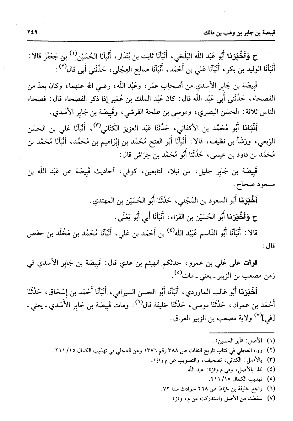 ح وأخبرنا أبو عبد الله البلخي أنبأنا ثابت بن بندار أنبأنا الحسين (1) بن جعفر قالا أنبأنا الوليد بن بكر أنبأنا علي بن أحمد أنبأنا صالح العجلي حدثني أبي قال (2) قبيصة بن جابر الأسدي من أصحاب عمر وعبد الله Bهما وكان يعد من الفصحاء حدثني أبي عبد الله قال كان عبد الملك بن عمير إذا ذكر الفصحاء قال فصحاء الناس ثلاثة الحسن البصري وموسى بن طلحة القرشي وقبيصة بن جابر الأسدي أنبأنا أبو محمد بن الأكفاني حدثنا عبد العزيز الكتاني (3) أنبأنا علي بن الحسن الربعي ورشأ بن نظيف قالا أنبأنا أبو الفتح محمد بن إبراهيم بن محمد أنبأنا محمد بن محمد بن داود بن عيسى حدثنا أبو محمد بن خراش قال قبيصة بن جابر جليل من نبلاء التابعين كوفي أحاديث قبيصة عن عبد الله بن مسعود صحاح ح أخبرنا أبو السعود بن المجلي حدثنا أبو الحسين بن المهتدي وأخبرنا أبو الحسين بن الفراء أنبأنا أبي أبو يعلى قالا أنبأنا أبو القاسم عبيد الله (4) بن أحمد بن علي أنبأنا محمد بن مخلد بن حفص قال قرأت على علي بن عمرو حدثكم الهيثم بن عيد قال قبيصة بن جابر الأسدي في زمن مصعب بن الزبير يعني مات (5) أخبرنا أبو غالب الماوردي أنبأنا أبو الحسن السيرافي أنبأنا أحمد بن إسحاق حدثنا أحمد بن عمران حدثنا موسى حدثنا خليفة قال (6) ومات قبيصة بن جابر الأسدي يعني في (7) ولاية مصعب بن الزبير العراق