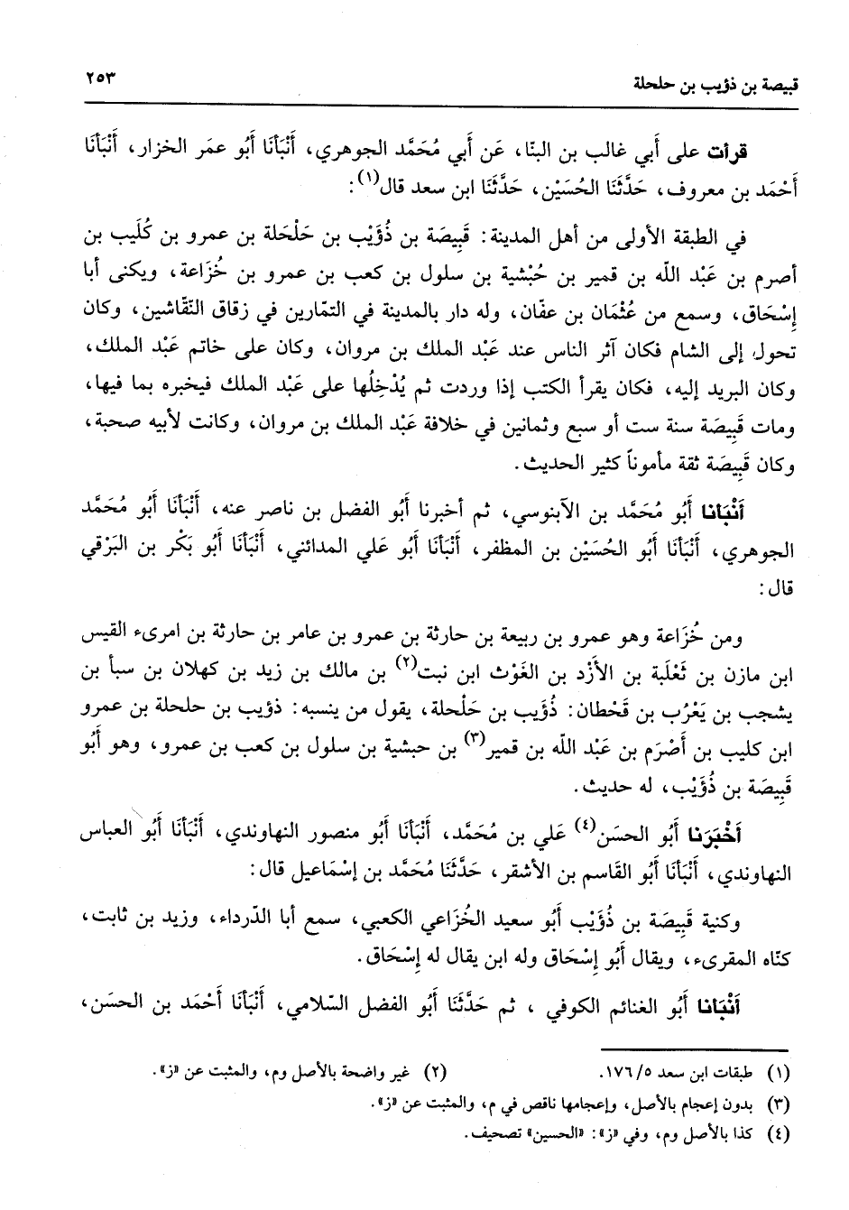 قرأت على أبي غالب بن البنا عن أبي محمد الجوهري أنبأنا أبو عمر الخزار أنبأنا أحمد بن معروف حدثنا الحسين حدثنا ابن سعد قال (1) في الطبقة الأولى من أهل المدينة قبيصة بن ذؤيب بن حلحلة بن عمرو بن كليب بن أصرم بن عبد الله بن قمير بن حبشية بن سلول بن كعب بن عمرو بن خزاعة ويكنى أبا إسحاق وسمع من عثمان بن عفان وله دار بالمدينة في التمارين في زقاق النقاشين وكان تحول إلى الشام فكان آثر الناس عند عبد الملك بن مروان وكان على خاتم عبد الملك وكان البريد إليه فكان يقرأ الكتب إذا وردت ثم يدخلها على عبد الملك فيخبره بما فيها ومات قبيصة سنة ست أو سبع وثمانين في خلافة عبد الملك بن مروان وكانت لأبيه صحبة وكان قبيصة ثقة مأمونا كثير الحديث أنبأنا أبو محمد بن الآبنوسي ثم أخبرنا أبو الفضل بن ناصر عنه أنبأنا أبو محمد الجوهري أنبأنا أبو الحسين بن المظفر أنبأنا أبو علي المدائني أنبأنا أبو بكر بن البرقي قال ومن خزاعة وهو عمرو بن ربيعة بن حارثة بن عمرو بن عامر بن حارثة بن امرئ القيس ابن مازن بن ثعلبة بن الأزد بن الغوث ابن نبت (2) بن مالك بن زيد بن كهلان بن سبأ بن يشجب بن يعرب بن قحطان ذؤيب بن حلحلة يقول من ينسبه ذؤيب بن حلحلة بن عمرو بن كليب بن أصرم بن عبد الله بن قمير (3) بن حبشية بن سلول بن كعب بن عمرو وهو أبو قبيصة بن ذؤيب له حديث أخبرنا أبو الحسن (4) علي بن محمد أنبأنا أبو منصور النهاوندي أنبأنا أبو العباس النهاوندي أنبأنا أبو القاسم بن الأشقر حدثنا محمد بن إسماعيل قال وكنية قبيصة بن ذؤيب أبو سعيد الخزاعي الكعبي سمع أبا الدرداء وزيد بن ثابت كناه المقرئ ويقال أبو إسحاق وله ابن يقال له إسحاق أنبأنا أبو الغنائم الكوفي ثم حدثنا أبو الفضل السلامي أنبأنا أحمد بن الحسن