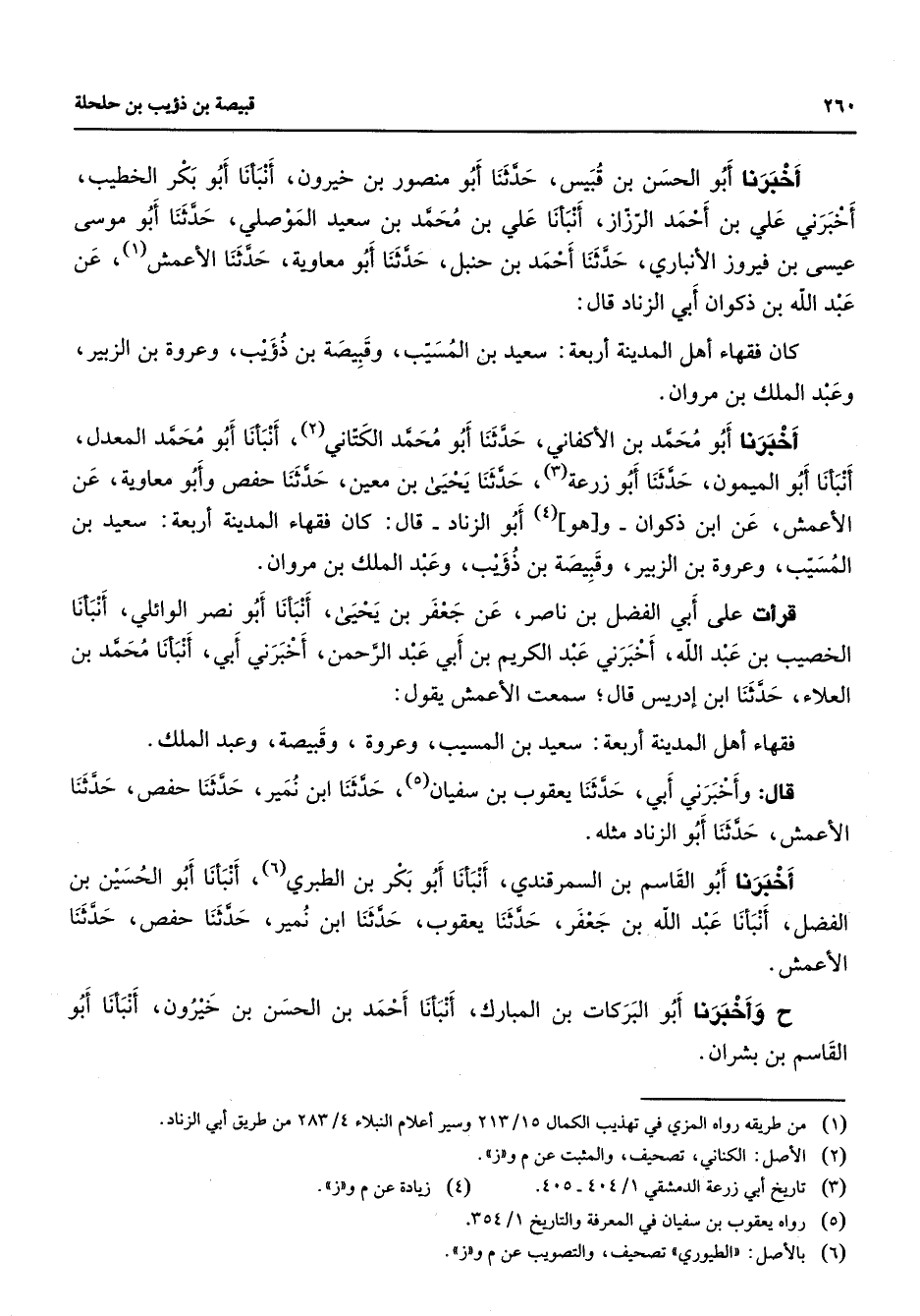 أخبرنا أبو الحسن بن قبيس حدثنا أبو منصور بن خيرون أنبأنا أبو بكر الخطيب أخبرني علي بن أحمد الرزاز أنبأنا علي بن محمد بن سعيد الموصلي حدثنا أبو موسى عيسى بن فيروز الأنباري حدثنا أحمد بن حنبل حدثنا أبو معاوية حدثنا الأعمش (1) عن عبد الله بن ذكوان أبي الزناد قال كان فقهاء أهل المدينة أربعة سعيد بن المسيب وقبيصة بن ذؤيب وعروة بن الزبير وعبد الملك بن مروان أخبرنا أبو محمد بن الأكفاني حدثنا أبو محمد الكتاني (2) أنبأنا أبو محمد المعدل أنبأنا أبو الميمون حدثنا أبو زرعة (3) حدثنا يحيى بن معين حدثنا حفص وأبو معاوية عن الأعمش عن ابن ذكوان وهو (4) أبو الزناد قال كان فقهاء المدينة أربعة سعيد بن المسيب وعروة بن الزبير وقبيصة بن ذؤيب وعبد الملك بن مروان قرأت على أبي الفضل بن ناصر عن جعفر بن يحيى أنبأنا أبو نصر الوائلي أنبأنا الخصيب بن عبد الله أخبرني عبد الكريم بن أبي عبد الرحمن أخبرني أبي أنبأنا محمد بن العلاء حدثنا ابن إدريس قال سمعت الأعمش يقول فقهاء أهل المدينة أربعة سعيد بن المسيب وعروة وقبيصة وعبد الملك قال وأخبرني أبي حدثنا يعقوب بن (5) سفيان حدثنا ابن نمير حدثنا حفص حدثنا الأعمش حدثنا أبو الزناد مثله أخبرنا أبو القاسم بن السمرقندي أنبأنا أبو بكر بن الطبري (6) أنبأنا أبو الحسين بن الفضل أنبأنا عبد الله بن جعفر حدثنا يعقوب حدثنا ابن نمير حدثنا حفص حدثنا الأعمش وأخبرنا أبو البركات بن المبارك أنبأنا أحمد بن الحسن بن خيرون أنبأنا أبو القاسم بن بشران