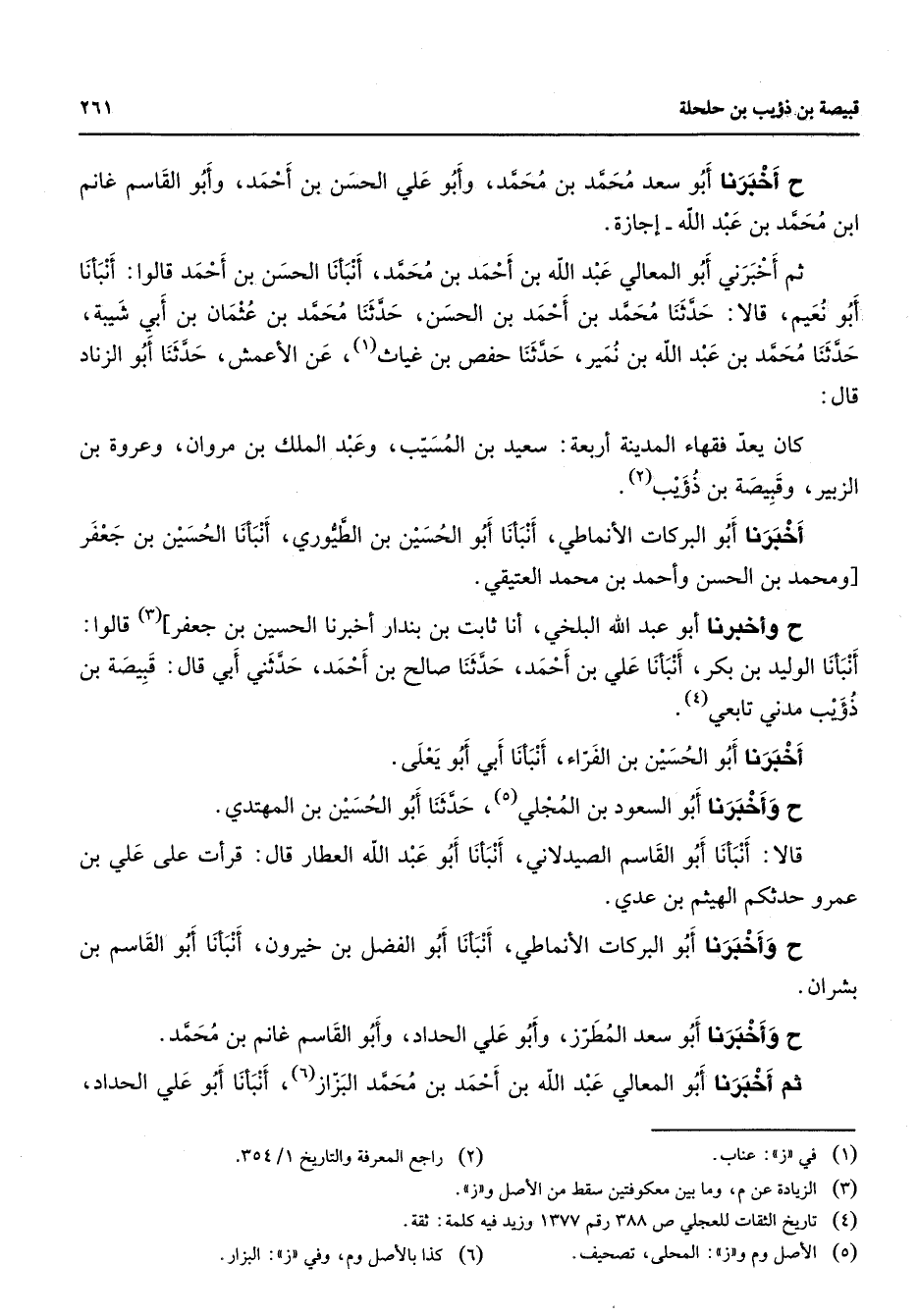أخبرنا أبو سعد محمد بن محمد وأبو علي الحسن بن أحمد وأبو القاسم غانم ابن محمد بن عبد الله إجازة ثم أخبرني أبو المعالي عبد الله بن أحمد بن محمد أنبأنا الحسن بن أحمد قالوا أنبأنا أبو نعيم قالا حدثنا محمد بن أحمد بن الحسن حدثنا محمد بن عثمان بن أبي شيبة حدثنا محمد بن عبد الله بن نمير حدثنا حفص بن غياث (1) عن الأعمش حدثنا أبو الزناد قال كان يعد فقهاء المدينة أربعة سعيد بن المسيب وعبد الملك بن مروان وعروة بن الزبير وقبيصة بن ذؤيب (2) أخبرنا أبو البركات الأنماطي أنبأنا أبو الحسين بن الطيوري أنبأنا الحسن بن جعفر ومحمد بن الحسن وأحمد بن محمد العتيقي وأخبرنا أبو عبد الله البلخي أنا ثابت بن بندار أخبرنا الحسن بن جعفر (3) قالوا أنبأنا الوليد بن بكر أنبأنا علي بن أحمد حدثنا صالح بن أحمد حدثني أبي قال قبيصة بن ذؤيب مدني تابعي (4) أخبرنا أبو الحسين بن الفراء أنبأنا أبي أبو يعلى وأخبرنا أبو السعود بن المجلي (5) حدثنا أبو الحسين بن المهتدي قالا أنبأنا أبو القاسم الصيدلاني أنبأنا أبو عبد الله العطار قال قرأت على علي بن عمرو حدثكم الهيثم بن عدي وأخبرنا أبو البركات الأنماطي أنبأنا أبو الفضل بن خيرون أنبأنا أبو القاسم بن بشران وأخبرنا أبو سعد المطرز وأبو علي الحداد وأبو القاسم غانم بن محمد ثم أخبرنا أبو المعالي عبد الله بن أحمد بن محمد البزاز أنبأنا أبو علي الحداد
