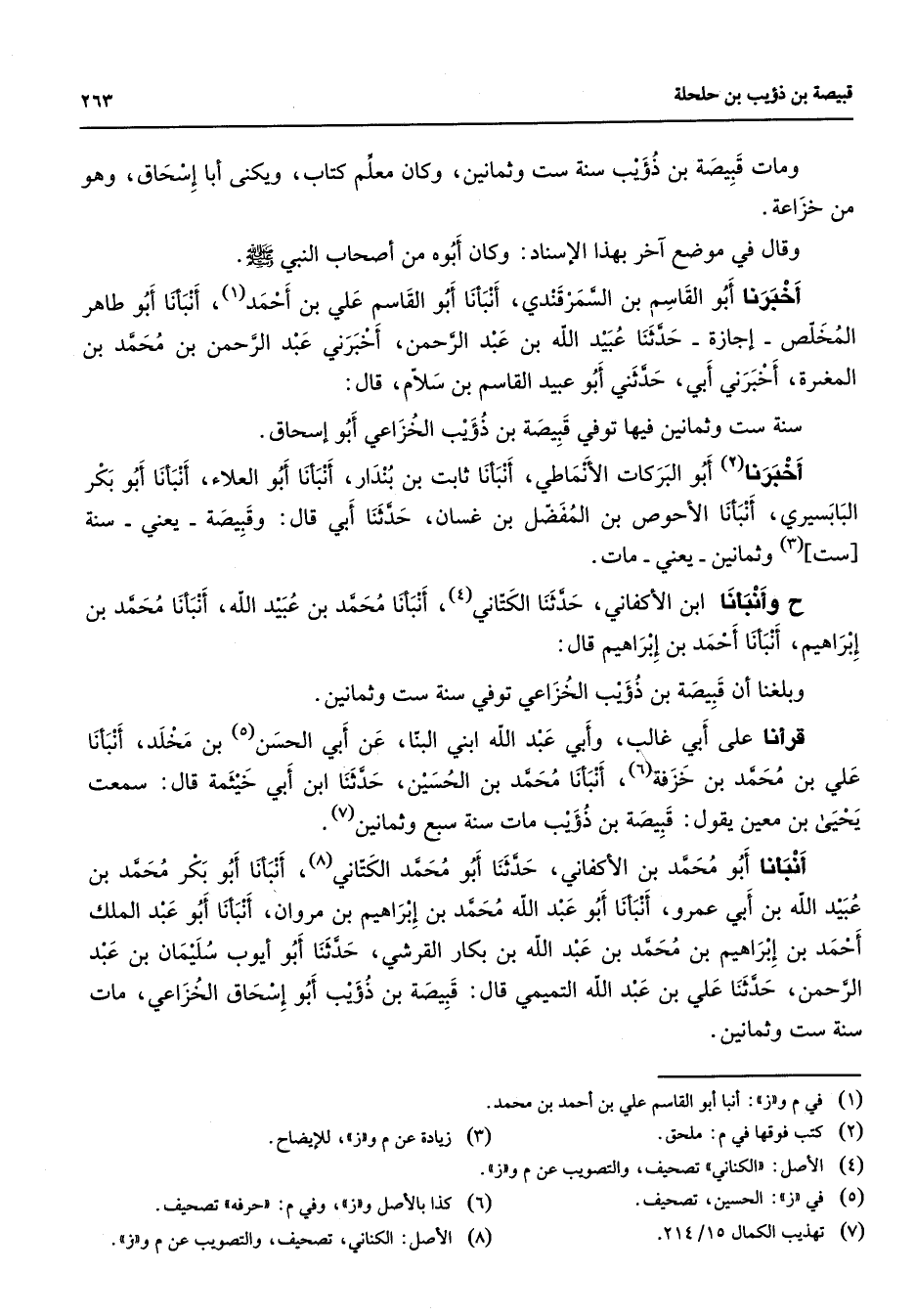 ومات قبيصة بن ذؤيب سنة ست وثمانين وكان معلم كتاب ويكنى أبا إسحاق وهو من خزاعة وقال في موضع آخر بهذا الإسناد وكان أبوه من أصحاب النبي (صلى الله عليه وسلم) أخبرنا أبو القاسم بن السمرقندي أنبأنا أبو القاسم علي بن أحمد (1) أنبأنا أبو طاهر المخلص إجازة حدثنا عبيد الله بن عبد الرحمن أخبرني عبد الرحمن بن محمد بن المغيرة أخبرني أبي حدثني أبو عبيد القاسم بن سلام قال سنة ست وثمانين فيها توفي قبيصة بن ذؤيب الخزاعي أبو إسحاق أخبرنا (2) أبو البركات الأنماطي أنبأنا ثابت بن بندار أنبأنا أبو العلاء أنبأنا أبو بكر البابسيري أنبأنا الأحوص بن المفضل بن غسان حدثنا أبي قال وقبيصة يعني سنة ست (3) وثمانين يعني مات وأنبأنا ابن الأكفاني حدثنا الكتاني (4) أنبأنا محمد بن عبيد الله أنبأنا محمد بن إبراهيم أنبأنا أحمد بن إبراهيم قال وبلغنا أن قبيصة بن ذؤيب الخزاعي توفي سنة ست وثمانين قرأنا على أبي غالب وأبي عبد الله ابني البنا عن أبي الحسن (5) بن مخلد أنبأنا علي بن محمد بن خزفة (6) أنبأنا محمد بن الحسين حدثنا ابن أبي خيثمة قال سمعت يحيى بن معين يقول قبيصة بن ذؤيب مات سنة سبع وثمانين (7) أنبأنا أبو محمد بن الأكفاني حدثنا أبو محمد الكتاني (8) أنبأنا أبو بكر محمد بن عبيد الله بن أبي عمرو أنبأنا أبو عبد الله محمد بن إبراهيم بن مروان أنبأنا أبو عبد الملك أحمد بن إبراهيم بن محمد بن عبد الله بن بكار القرشي حدثنا أبو أيوب سليمان بن عبد الرحمن حدثنا علي بن عبد الله التميمي قال قبيصة بن ذؤيب أبو إسحاق الخزاعي مات سنة ست وثمانين