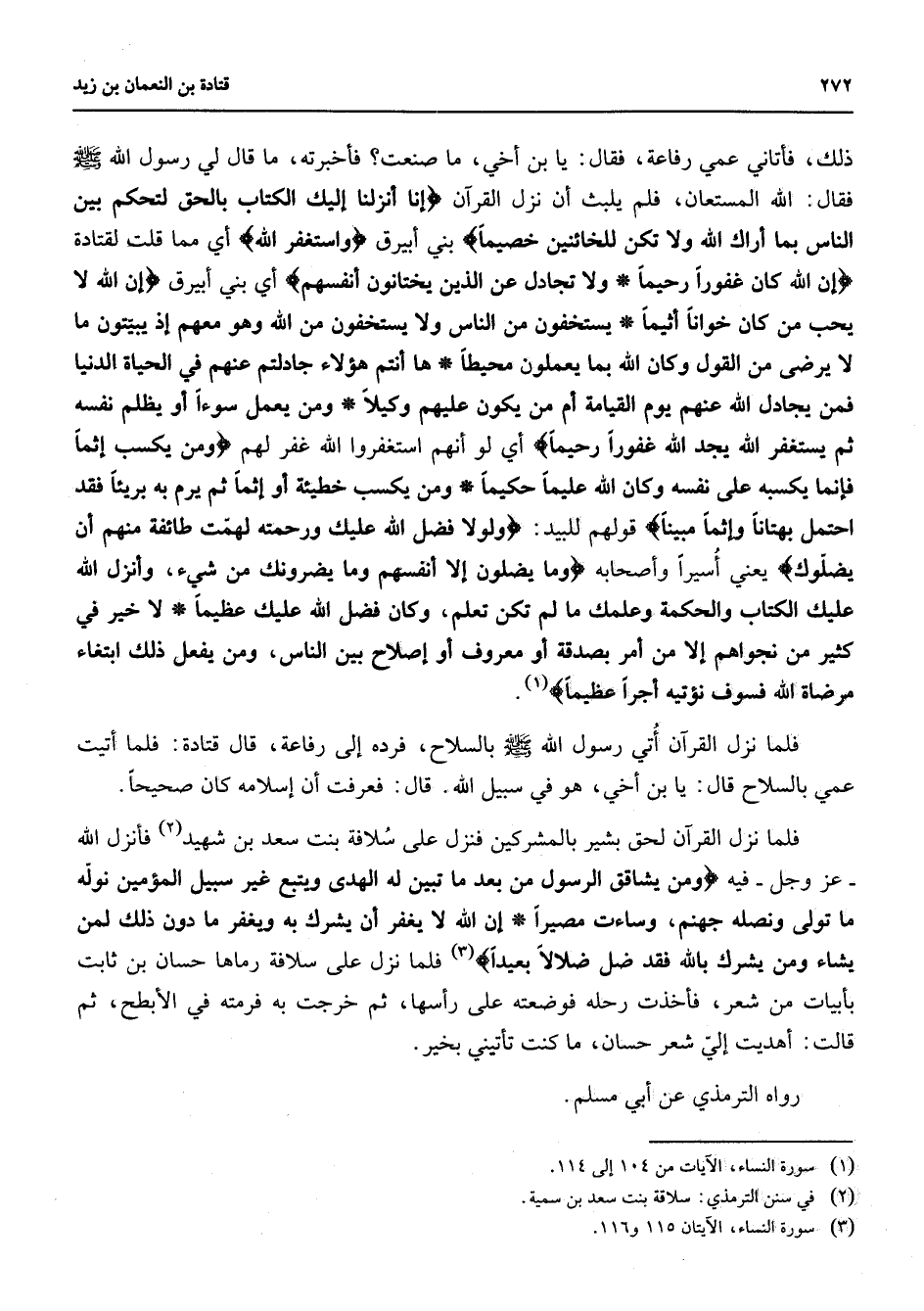 ذلك فأتاني عمي رفاعة فقال يا بن أخي ما صنعت فأخبرته ما قال لي رسول الله (صلى الله عليه وسلم) فقال الله المستعان فلم يلبث أن نزل القرآن " إنا أنزلنا إليك الكتاب بالحق لتحكم بين الناس بما أراك الله ولا تكن للخائنين خصيما " بني أبيرق " واستغفر الله " أي مما قلت لقتادة " إن الله كان غفورا رحيما ولا تجادل عن الذين يختانون أنفسهم " أي بني أبيرق " إن الله لا يحب من كان خوانا أثيما يستخفون من الناس ولا يستخفون من الله وهو معهم إذ يبيتون ما لا يرضى من القول وكان الله بما يعملون محيطا ها أنتم هؤلاء جادلتم عنهم في الحياة الدنيا فمن يجادل الله عنهم يوم القيامة أم من يكون عليهم وكيلا ومن يعمل سوءا أو يظلم نفسه ثم يستغفر الله يجد الله غفورا رحيما " أي لو أنهم استغفروا الله غفر لهم " ومن يكسب إثما فإنما يكسبه على نفسه وكان الله عليما حكيما ومن يكسب خطيئة أو إثما ثم يرم به بريئا فقد احتمل بهتانا وإثما مبينا " قولهم للبيد " ولولا فضل الله عليك ورحمته لهمت طائفة منهم أن يضلوك " يعني أسيرا وأصحابه " وما يضلون إلا أنفسهم وما يضرونك من شئ وأنزل الله عليك الكتاب والحكمة وعلمك ما لم تكن تعلم وكان فضل الله عليك عظيما لا خير في كثير من نجواهم إلا من أمر بصدقة أو معروف أو إصلاح بين الناس ومن يفعل ذلك ابتغاء مرضاة الله فسوف نؤتيه أجرا عظيما " (1) فلما نزل القرآن أتي رسول الله (صلى الله عليه وسلم) بالسلاح فرده إلى رفاعة قال قتادة فلما أتيت عمي بالسلاح قال يا بن أخي هو في سبيل الله قال فعرفت أن إسلامه كان صحيحا فلما نزل القرآن لحق بشير بالمشركين فنزل على سلافة بنت سعد بن شهيد (2) فأنزل الله عز وجل فيه " ومن يشاقق الرسول من بعد ما تبين له الهدى ويتبع غير سبيل المؤمنين نوله ما تولى ونصله جهنم وساءت مصيرا إن الله لا يغفر أن يشرك به ويغفر ما دون ذلك لمن يشاء ومن يشرك بالله فقد ضل ضلالا بعيدا " (3) فلما نزل على سلافة رماها حسان بن ثابت بأبيات من شعر فأخذت رحله فوضعته على رأسها ثم خرجت به فرمته في الأبطح ثم قالت أهديت إلي شعر حسان ما كنت تأتيني بخير رواه الترمذي عن أبي مسلم
