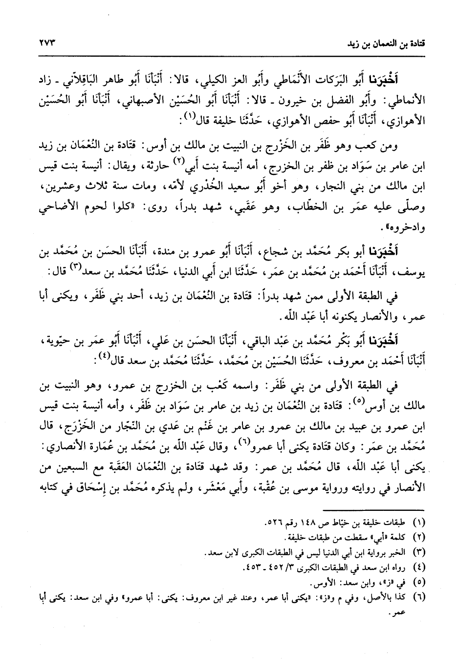 أخبرنا أبو البركات الأنماطي وأبو العز الكيلي قالا أنبأنا أبو طاهر الباقلاني زاد الأنماطي وأبو الفضل بن خيرون قالا أنبأنا أبو الحسين الأصبهاني أنبأنا أبو الحسين الأهوازي أنبأنا أبو حفص الأهوازي حدثنا خليفة قال (1) ومن كعب وهو ظفر بن الخزرج بن النبيت بن مالك بن أوس قتادة بن النعمان بن زيد ابن عامر بن سواد بن ظفر بن الخزرج أمه أنيسة بنت أبي (2) حارثة ويقال أنيسة بنت قيس ابن مالك من بني النجار وهو أخو أبو سعيد الخدري لأمه ومات سنة ثلاث وعشرين وصلى عليه عمر بن الخطاب وهو عقبي شهد بدرا روى كلوا لحوم الأضاحي وادخروه أخبرنا أبو بكر محمد بن شجاع أنبأنا أبو عمرو بن مندة أنبأنا الحسن بن محمد بن يوسف أنبأنا أحمد بن محمد بن عمر حدثنا ابن أبي الدنيا حدثنا محمد بن سعد (3) قال في الطبقة الأولى ممن شهد بدرا قتادة بن النعمان بن زيد أحد بني ظفر ويكنى أبا عمر والأنصار يكنونه أبا عبد الله أخبرنا أبو بكر محمد بن عبد الباقي أنبأنا الحسن بن علي أنبأنا أبو عمر بن حيوية أنبأنا أحمد بن معروف حدثنا الحسين بن محمد حدثنا محمد بن سعد قال في الطبقة الأولى من بني ظفر واسمه كعب بن الخزرج بن عمرو وهو النبيت بن مالك بن أوس (5) قتادة بن النعمان بن زيد بن عامر بن سواد بن ظفر وأمه أنيسة بنت قيس ابن عمرو بن عبيد بن مالك بن عمرو بن عامر بن غنم بن عدي بن النجار من الخزرج قال محمد بن عمر وكان قتادة يكنى أبا عمرو (6) وقال عبد الله بن محمد بن عمارة الأنصاري يكنى أبا عبد الله قال محمد بن عمر وقد شهد قتادة بن النعمان العقبة مع السبعين من الأنصار في روايته ورواية موسى بن عقبة وأبي معشر ولم يذكره محمد بن إسحاق في كتابه
