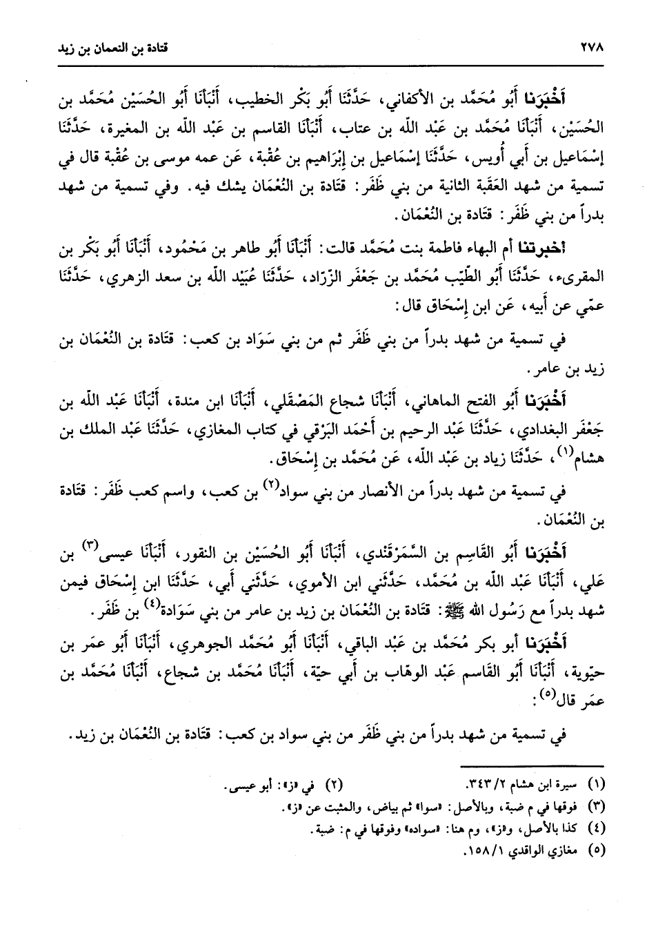 أخبرنا أبو محمد بن الأكفاني حدثنا أبو بكر الخطيب أنبأنا أبو الحسين محمد بن الحسين أنبأنا محمد بن عبد الله بن عتاب أنبأنا القاسم بن عبد الله بن المغيرة حدثنا إسماعيل بن أبي أويس حدثنا إسماعيل بن إبراهيم بن عقبة عن عمه موسى بن عقبة قال في تسمية من شهد العقبة الثانية من بني ظفر قتادة بن النعمان يشك فيه وفي تسمية من شهد بدرا من بني ظفر قتادة بن النعمان أخبرتنا أم البهاء فاطمة بنت محمد قالت أنبأنا أبو طاهر بن محمود أنبأنا أبو بكر بن المقرئ حدثنا أبو الطيب محمد بن جعفر الزراد حدثنا عبيد الله بن سعد الزهري حدثنا عمي عن أبيه عن ابن إسحاق قال في تسمية من شهد بدرا من بني ظفر ثم من بني سواد بن كعب قتادة بن النعمان بن زيد بن عامر أخبرنا أبو الفتح الماهاني أنبأنا شجاع المصقلي أنبأنا ابن مندة أنبأنا عبد الله بن جعفر البغدادي حدثنا عبد الرحيم بن أحمد البرقي في كتاب المغازي حدثنا عبد الملك بن هشام (1) حدثنا زياد بن عبد الله عن محمد بن إسحاق في تسمية من شهد بدرا من الأنصار من بني سواد بن كعب واسم كعب ظفر قتادة بن النعمان أخبرنا أبو القاسم بن السمرقندي أنبأنا أبو الحسين بن النقور أنبأنا عيسى بن علي أنبأنا عبد الله بن محمد حدثني ابن الأموي حدثني أبي حدثنا ابن إسحاق فيمن شهد بدرا مع رسول الله (صلى الله عليه وسلم) قتادة بن النعمان بن زيد بن عامر من بني سوادة (4) بن ظفر أخبرنا أبو بكر محمد بن عبد الباقي أنبأنا أبو محمد الجوهري أنبأنا أبو عمر بن حيوية أنبأنا أبو القاسم عبد الوهاب بن أبي حية أنبأنا محمد بن شجاع أنبأنا محمد بن عمر قال (5) في تسمية من شهد بدرا من بني ظفر من بني سواد بن كعب قتادة بن النعمان بن زيد