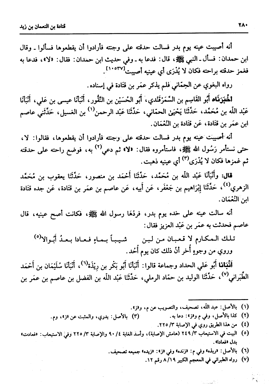 أنه أصيبت عينه يوم بدر فسالت حدقته على وجنته فأرادوا أن يقطعوها فسألوا وقال ابن حمدان فسأل النبي (صلى الله عليه وسلم) قال فدعا به وفي حديث ابن حمدان فقال لا فدعا به فغمز حدقته براحته فكان لا يدرى أي عينيه أصيبت