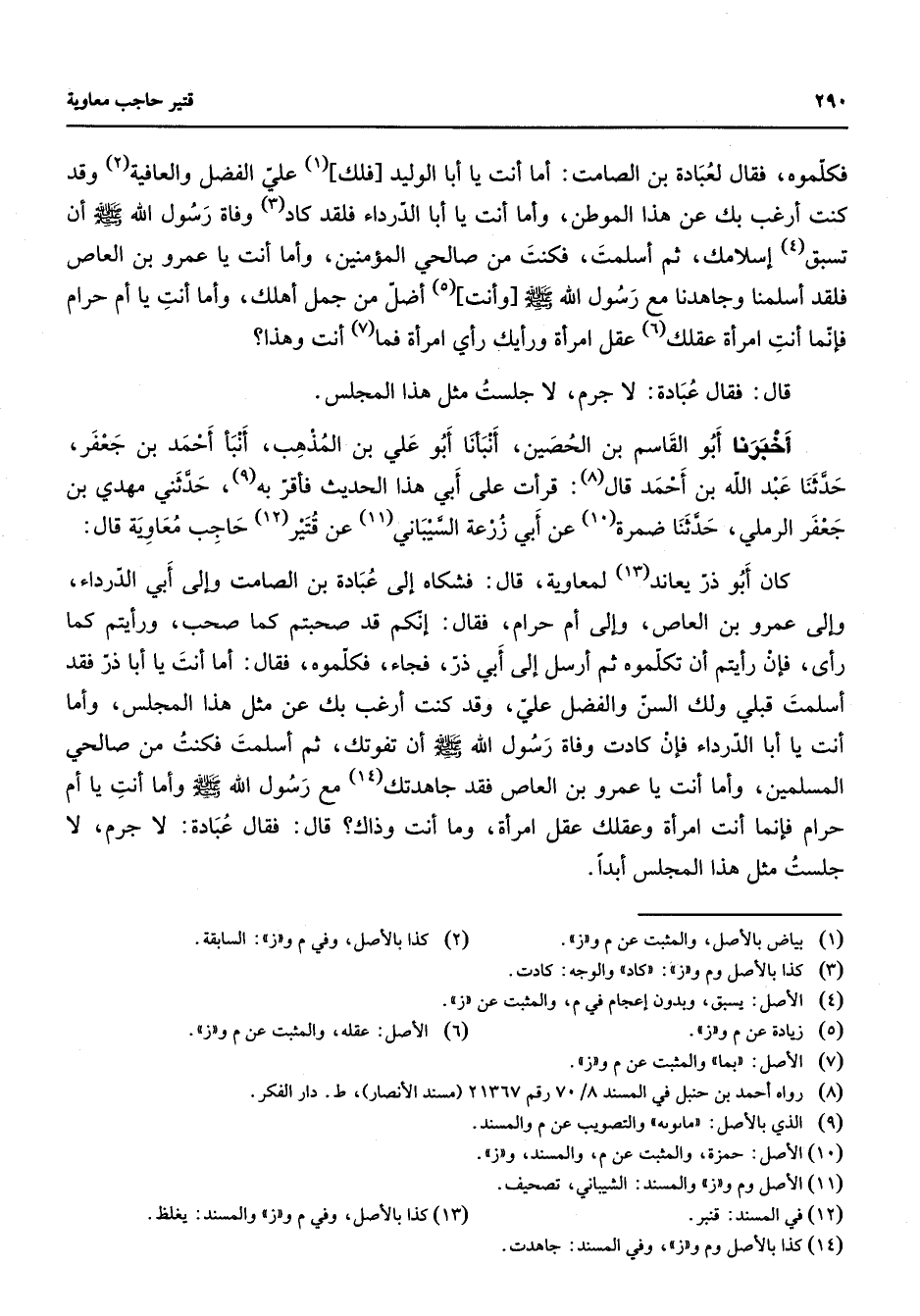 فكلموه فقال لعبادة بن الصامت أما أنت يا أبا الوليد فلك (1) علي الفضل والعافية (2) وقد كنت أرغب بك عن هذا الموطن وأما أنت يا أبا الدرداء فلقد كاد (3) وفاة رسول الله (صلى الله عليه وسلم) أن تسبق (4) إسلامك ثم أسلمت فكنت من صالحي المؤمنين وأما أنت يا عمرو بن العاص فلقد أسلمنا وجاهدنا مع رسول الله (صلى الله عليه وسلم) وأنت (5) أضل من جمل أهلك وأما أنت يا أم حرام فإنما أنت امرأة عقلك (6) عقل امرأة ورأيك رأي امرأة فما (7) أنت وهذا قال فقال عبادة لا جرم لا جلست مثل هذا المجلس أخبرنا أبو القاسم بن الحصين أنبأنا أبو علي بن المذهب أنبأ أحمد بن جعفر حدثنا عبد الله بن أحمد قال (8) قرأت على أبي هذا الحديث فأقر به (9) حدثني مهدي بن جعفر الرملي حدثنا ضمرة (10) عن أبي زرعة السيباني (11) عن قتير (12) حاجب معاوية قال كان أبو ذر يعاند (13) لمعاوية قال فشكاه إلى عبادة بن الصامت وإلى أبي الدرداء وإلى عمرو بن العاص وإلى أم حرام فقال إنكم قد صحبتم كما صحب ورأيتم كما رأى فإن رأيتم أن تكلموه ثم أرسل إلى أبي ذر فجاء فكلموه فقال أما أنت يا أبا ذر فقد أسلمت قبلي ولك السن والفضل علي وقد كنت أرغب بك عن مثل هذا المجلس وأما أنت يا أبا الدرداء فإن كادت وفاة رسول الله (صلى الله عليه وسلم) أن تفوتك ثم أسلمت فكنت من صالحي المسلمين وأما أنت يا عمرو بن العاص فقد جاهدتك (14) مع رسول الله (صلى الله عليه وسلم) وأما أنت يا أم حرام فإنما أنت امرأة وعقلك عقل امرأة وما أنت وذاك قال فقال عبادة لا جرم لا جلست مثل هذا المجلس أبدا