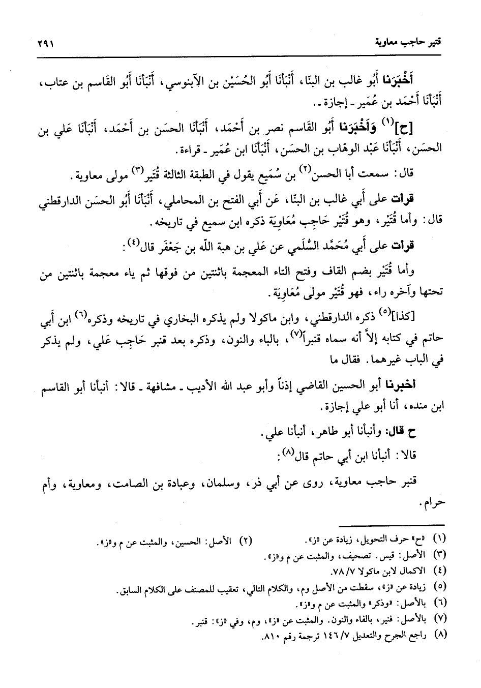 أخبرنا أبو غالب بن البنا أنبأنا أبو الحسين بن الآبنوسي أنبأنا أبو القاسم بن عتاب أنبأنا أحمد بن عمير إجازة (1) وأخبرنا أبو القاسم نصر بن أحمد أنبأنا الحسن بن أحمد أنبأنا علي بن الحسن أنبأنا عبد الوهاب بن الحسن أنبأنا ابن عمير قراءة قال سمعت أبا الحسن (2) بن سميع يقول في الطبقة الثالثة قتير (3) مولى معاوية قرأت على أبي غالب بن البنا عن أبي الفتح بن المحاملي أنبأنا أبو الحسن الدارقطني قال وأما قتير وهو قتير حاجب معاوية ذكره ابن سميع في تاريخه قرأت على أبي محمد السلمي عن علي بن هبة الله بن جعفر قال (4) وأما قتير بضم القاف وفتح التاء المعجمة باثنتين من فوقها ثم ياء معجمة باثنتين من تحتها وآخره راء فهو قتير مولى معاوية كذا (5) ذكره الدارقطني وابن ماكولا ولم يذكره البخاري في تاريخه وذكره ابن أبي حاتم في كتابه إلا أنه سماه قنبرا (7) بالباء والنون وذكره بعد قنبر حاجب علي ولم يذكر في الباب غيرهما فقال ما أخبرنا أبو الحسين القاضي إذنا وأبو عبد الله الأديب مشافهة قالا أنبأنا أبو القاسم ابن منده أنا أبو علي إجازة قال وأنبأنا أبو طاهر أنبأنا علي قالا أنبأنا ابن أبي حاتم قال (8) قنبر حاجب معاوية روى عن أبي ذر وسلمان وعبادة بن الصامت ومعاوية وأم حرام