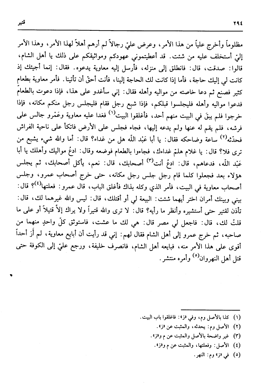 مظلوما وأخرج عليا من هذا الأمر وعرض علي رجالا لم أرهم أهلا لهذا الأمر وهذا الأمر إلي أستخلف عليه من شئت قد أعطيتموني عهودكم ومواثيقكم على ذلك يا أهل الشام قالوا صدقت قال فانطلق إلى منزله فأرسل إليه معاوية يدعوه فقال إنما أجيئك إذ كانت لي إليك حاجة فأما إذا كانت لك الحاجة إلينا فأنت أحق أن تأتينا فأمر معاوية بطعام كثير فصنع ثم دعا خاصته من مواليه وأهله فقال إني سأغدو على هذا فإذا دعوت بالطعام فدعوا مواليه وأهله فليجلسوا قبلكم فإذا شبع رجل فقام فليجلس رجل منكم مكانه فإذا خرجوا فلم يبق في البيت منهم أحد فأغلقوا البيت (1) فغدا عليه معاوية وعمرو جالس على فرشه فلم يقم له عنها ولم يدعه إليها فجاء فجلس على الأرض فاتكأ على ناحية الفراش فحدثه (2) ساعة وضاحكه فقال يا أبا عبد الله هل من غداء قال أما والله شئ يشبع من ترى فلا قال يا غلام هلم غداءك فجاءوا بالطعام فوضعه وقال ادع مواليك وأهلك يا أبا عبد الله فدعاهم قال ادع أنت (3) أصحابك قال نعم يأكل أصحابك ثم يجلس هؤلاء بعد فجعلوا كلما قام رجل جلس رجل مكانه حتى خرج أصحاب عمرو وجلس أصحاب معاوية في البيت فأمر الذي وكله بذاك فأغلق الباب قال عمرو فعلتها (4) قال بيني وبينك أمران اختر أيهما شئت البيعة لي أو أقتلك قال ليس والله غيرهما لك قال تأذن لقتير حتى أستشيره وأنظر ما رأيه قال لا ترى والله قتيرا ولا يراك إلا قتيلا أو على ما قلت لك قال فاجعل لي مصر قال هي لك ما عشت فاستوثق كل واحد منهما من صاحبه ثم خرج عمرو إلى أهل الشام فقال لهم إني قد رأيت أن أبايع معاوية لم أر أحدا أقوى على هذا الأمر منه فبايعه أهل الشام فانصرف خليفة ورجع علي إلى الكوفة حتى قتل أهل النهروان (5) وأمره منتشر