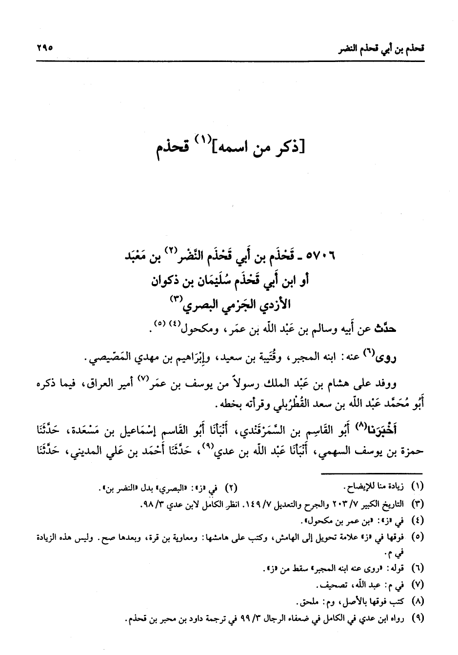 5706 - قحذم بن أبي قحذم النضر (2) بن معبد أو ابن أبي قحذم سليمان بن ذكوان الأزدي الجرمي البصري (3) حدث عن أبيه وسالم بن عبد الله بن عمر ومكحول (4) (5) روى (6) عنه ابنه المجبر وقتيبة بن سعيد وإبراهيم بن مهدي المصيصي ووفد على هشام بن عبد الملك رسولا من يوسف بن عمر (7) أمير العراق فيما ذكره أبو محمد عبد الله بن سعد القطربلي وقرأته بخطه أخبرنا (8) أبو القاسم بن السمرقندي أنبأنا أبو القاسم إسماعيل بن مسعدة حدثنا حمزة بن يوسف السهمي أنبأنا عبد الله بن عدي (9) حدثنا أحمد بن علي المديني حدثنا