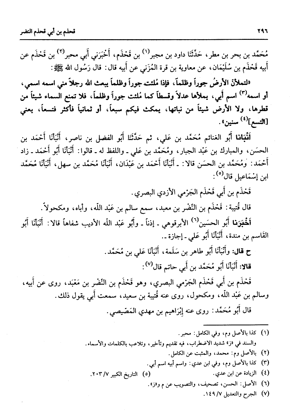 محمد بن بحر بن مطر حدثنا داود بن مجبر (1) بن قحذم أخبرني أبي محبر (2) بن قحذم عن أبيه قحذم بن سليمان عن معاوية بن قرة المزني عن أبيه قال قال رسول الله (صلى الله عليه وسلم) لتملأن الأرض جورا وظلما فإذا ملئت جورا وظلما يبعث الله رجلا مني اسمه اسمي أو اسمه (3) اسم أبي يملأها عدلا وقسطا كما ملئت جورا وظلما فلا تمنع السماء شيئا من قطرها ولا الأرض شيئا من نباتها يمكث فيكم سبعا أو ثمانيا فأكثر فتسعا يعني التسع (4) سنين أنبأنا أبو الغنائم محمد بن علي ثم حدثنا أبو الفضل بن ناصر أنبأنا أحمد بن الحسن والمبارك بن عبد الجبار ومحمد بن علي واللفظ له قالوا أنبأنا أبو أحمد زاد أحمد ومحمد بن الحسن قالا أنبأنا أحمد بن عبدان أنبأنا محمد بن سهل أنبأنا محمد ابن إسماعيل قال (5) قحذم بن أبي قحذم الجرمي الأزدي البصري قال قتيبة قحذم بن النضر بن معبد سمع سالم بن عبد الله وأباه ومكحولا أخبرنا أبو الحسين (6) الأبرقوهي إذنا وأبو عبد الله الأديب شفاها قالا أنبأنا أبو القاسم بن مندة أنبأنا أبو علي إجازة قال وأنبأنا أبو طاهر بن سلمة أنبأنا علي بن محمد قالا أنبأنا أبو محمد بن أبي حاتم قال (7) قحذم بن أبي قحذم الجرمي البصري وهو قحذم بن النضر بن معبد روى عن أبيه وسالم بن عبد الله ومكحول روى عنه قتيبة بن سعيد سمعت أبي يقول ذلك قال أبو محمد روى عنه إبراهيم بن مهدي المصيصي