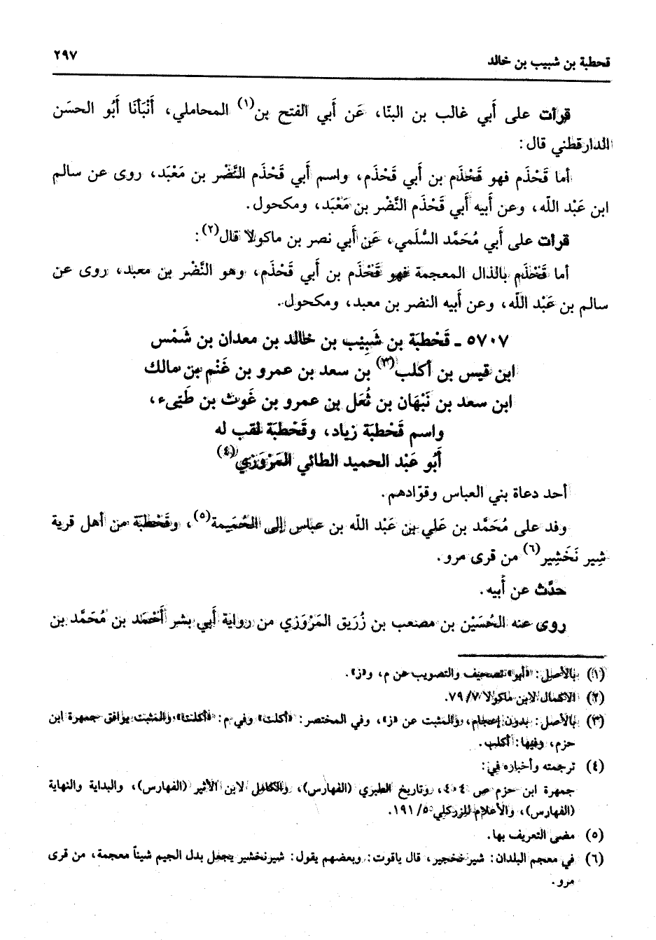 5707 - قحطبة بن شبيب بن خالد بن معدان بن شمس ابن قيس بن أكلب (3) بن سعد بن عمرو بن غنم بن مالك ابن سعد بن نبهان بن ثعل بن عمرو بن غوث بن طئ واسم قحطبة زياد وقحطبة لقب له أبو عبد الحميد الطائي المروزي (4) أحد دعاة بني العباس وقوادهم وفد على محمد بن علي بن عبد الله بن عباس إلى الحميمة (5) وقحطبة من أهل قرية شير نخشير (6) من قرى مرو حدث عن أبيه روى عنه الحسين بن مصعب بن زريق المروزي من رواية أبي بشر أحمد بن محمد بن