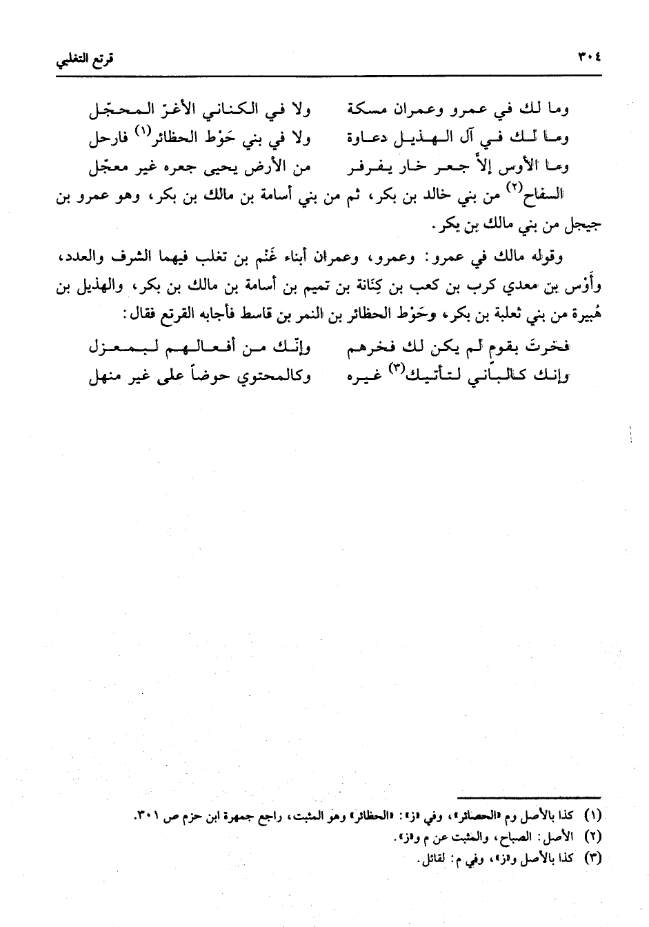 وما لك في عمرو وعمران مسكة * ولا في الكناني الأغر المحجل وما لك في آل الهذيل دعاوة * ولا في بني حوط الحظائر (1) فارحل وما الأوس إلا جعر خار يفرفر * من الأرض يحيى جعره غير معجل * السفاح (2) من بني خالد بن بكر ثم من بني أسامة بن مالك بن بكر وهو عمرو بن جيجل من بني مالك بن بكر وقوله مالك في عمرو وعمرو وعمران أبناء غنم بن تغلب فيهما الشرف والعدد وأوس بن معدي كرب بن كعب بن كنانة بن تميم بن اسامة بن مالك بن بكر والهذيل بن هبيرة من بني ثعلبة بن بكر وحوط الحظائر بن النمر بن قاسط فأجابه القرتع فقال * فخرت بقوم لم يكن لك فخرهم * وإنك من أفعالهم لبمعزل وإنك كالباني لتأتيك (3) غيره * وكالمحتوي حوضا على غير منهل *
