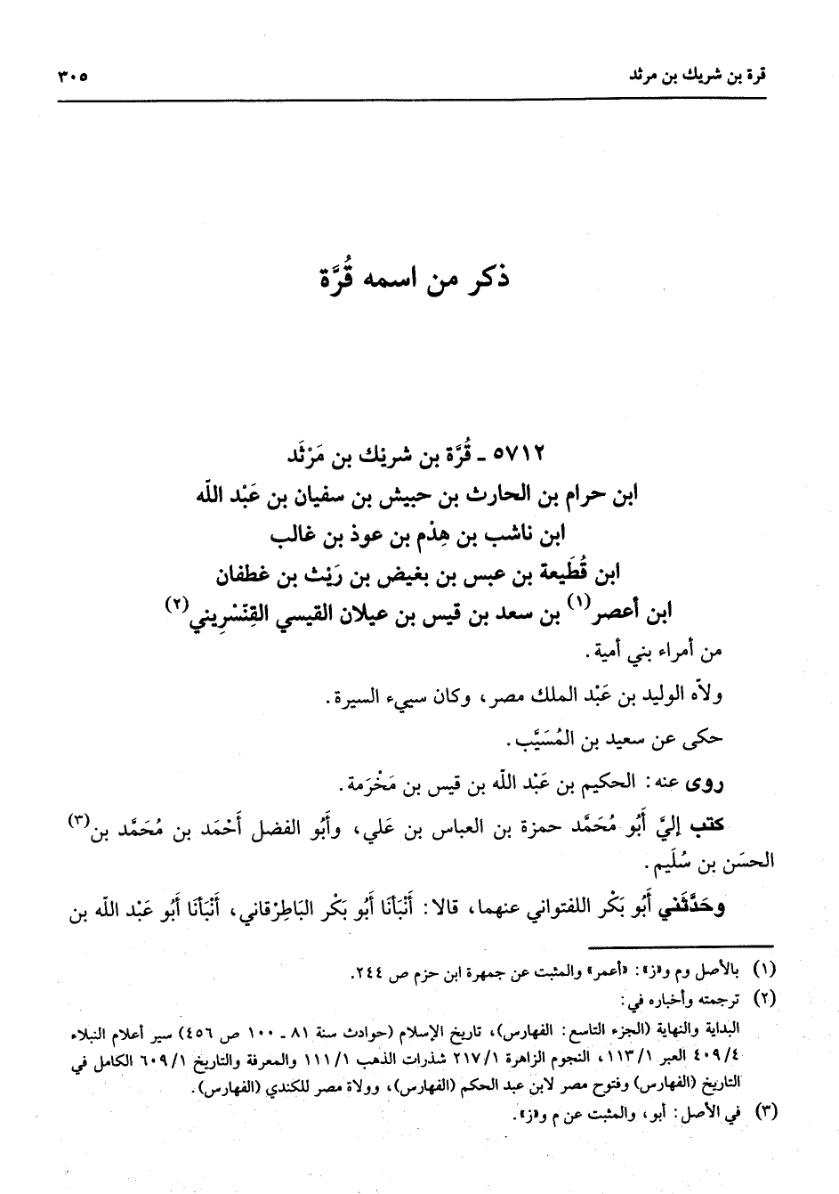 5712 - قرة بن شريك بن مرثد ابن حرام بن الحارث بن حبيش بن سفيان بن عبد الله ابن ناشب بن هدم بن عوذ بن غالب ابن قطيعة بن عبس بن بغيض بن ريث بن غطفان ابن أعصر (1) بن سعد بن قيس بن عيلان القيسي القنسريني (2) من أمراء بني أمية ولاه الوليد بن عبد الملك مصر وكان سئ السيرة حكى عن سعيد بن المسيب روى عنه الحكيم بن عبد الله بن قيس بن مخرمة كتب إلي أبو محمد حمزة بن العباس بن علي وأبو الفضل أحمد بن محمد بن (3) الحسن بن سليم وحدثني أبو بكر اللفتواني عنهما قالا أنبأنا أبو بكر الباطرقاني أنبأنا أبو عبد الله بن