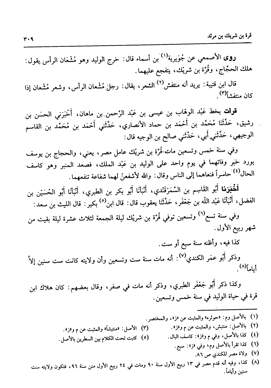 روى الأصمعي عن جويرية (1) بن أسماء قال خرج الوليد وهو مشعان الرأس يقول هلك الحجاج وقرة بن شريك يتفجع عليهما قال ابن قتيبة يريد أنه منتفش (2) الشعر يقال رجل مشعان الرأس وشعر مشعان إذا كان منتفشا (3) قرأت بخط عبد الوهاب بن عيسى بن عبد الرحمن بن ماهان أخبرني الحسن بن رشيق حدثنا محمد بن أحمد بن حماد الأنصاري حدثني أحمد بن محمد بن القاسم الوجيهي حدثني أبي حدثني صالح بن الوجيه قال وفي سنة خمس وتسعين مات قرة بن شريك عامل مصر يعني والحجاج بن يوسف بورد خبر وفاتهما في يوم واحد على الوليد بن عبد الملك فصعد المنبر وهو كاسف الحال (4) حاسرا فنعاهما إلى الناس وقال والله لأشفعن لهما شفاعة تنفعهما أخبرنا أبو القاسم بن السمرقندي أنبأنا أبو بكر بن الطبري أنبأنا أبو الحسين بن الفضل أنبأنا عبد الله بن جعفر حدثنا يعقوب قال قال ابن (5) بكير قال الليث بن سعد وفي سنة تسع (6) وتسعين توفي قرة بن شريك ليلة الجمعة لثلاث عشرة ليلة بقيت من شهر ربيع الأول كذا فيه وأظنه سنة سبع أو ست وذكر أبو عمر الكندي (7) أنه مات سنة ست وتسعين وأن ولايته كانت ست سنين إلا أياما (8) وكذا ذكر أبو جعفر الطبري وذكر أنه مات في صفر وقال بعضهم كان هلاك ابن قرة في حياة الوليد في سنة خمس وتسعين
