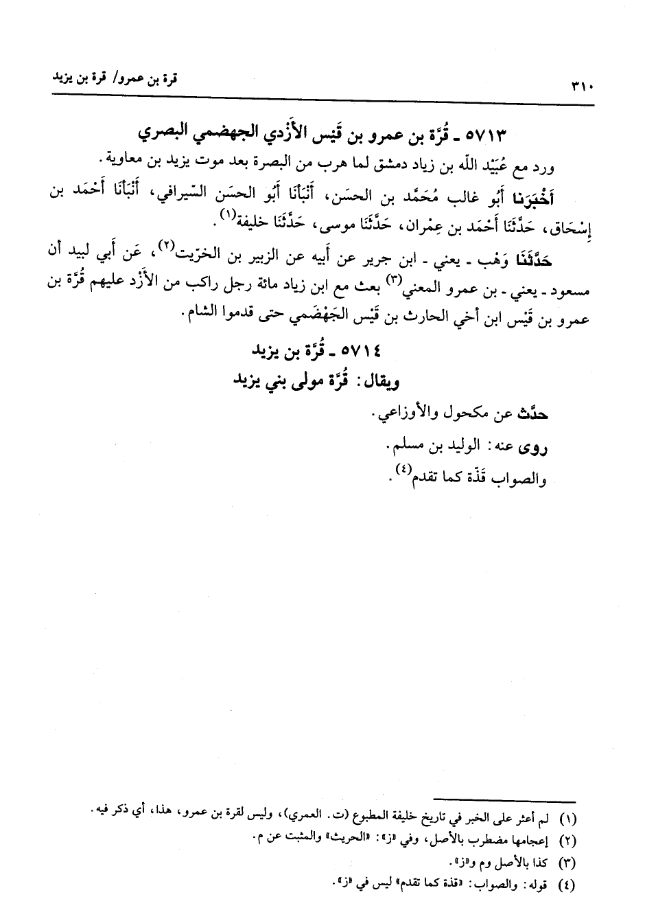 5713 - قرة بن عمرو بن قيس الأزدي الجهضمي البصري ورد مع عبيد الله بن زياد دمشق لما هرب من البصرة بعد موت يزيد بن معاوية أخبرنا أبو غالب محمد بن الحسن أنبأنا أبو الحسن السيرافي أنبأنا أحمد بن إسحاق حدثنا أحمد بن عمران حدثنا موسى حدثنا خليفة (1) حدثنا وهب يعني ابن جرير عن أبيه عن الزبير بن الخريت (2) عن أبي لبيد أن مسعود يعني بن عمرو المعني (3) بعث مع ابن زياد مائة رجل راكب من الأزد عليهم قرة بن عمرو بن قيس ابن أخي الحارث بن قيس الجهضمي حتى قدموا الشام