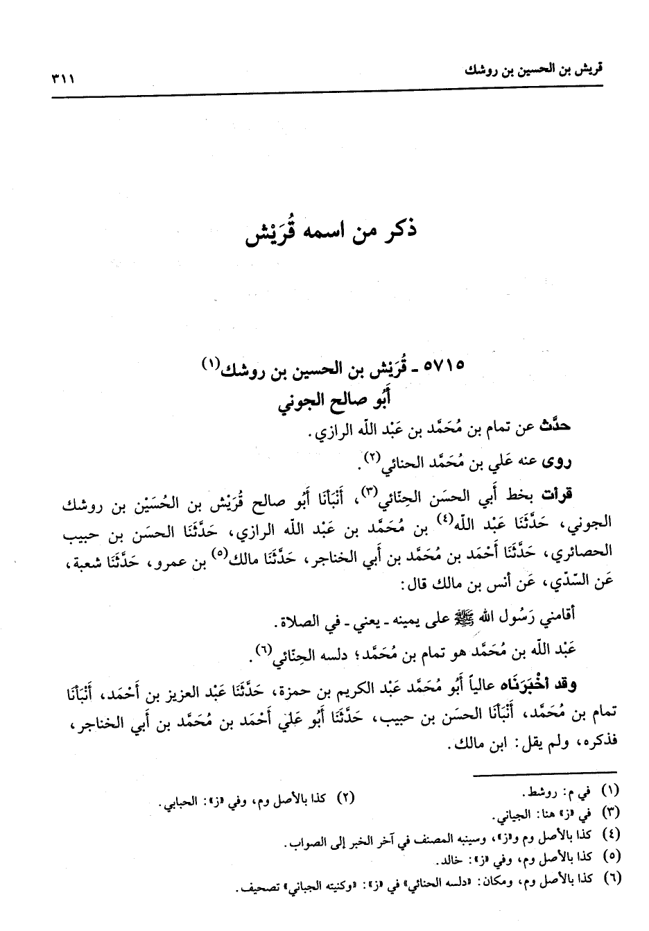 5715 - قريش بن الحسين بن روشك (1) أبو صالح الجوني حدث عن تمام بن محمد بن عبد الله الرازي روى عنه علي بن محمد الحنائي (2) قرأت بخط أبي الحسن الحنائي (3) أنبأنا أبو صالح قريش بن الحسين بن روشك الجوني حدثنا عبد الله (4) بن محمد بن عبد الله الرازي حدثنا الحسن بن حبيب الحصائري حدثنا أحمد بن محمد بن أبي الخناجر حدثنا مالك (5) بن عمرو حدثنا شعبة عن السدي عن أنس بن مالك قال أقامني رسول الله (صلى الله عليه وسلم) على يمينه يعني في الصلاة عبد الله بن محمد هو تمام بن محمد دلسه الحنائي (6) وقد أخبرناه عاليا أبو محمد عبد الكريم بن حمزة حدثنا عبد العزيز بن أحمد أنبأنا تمام بن محمد أنبأنا الحسن بن حبيب حدثنا أبو علي أحمد بن محمد بن أبي الخناجر فذكره ولم يقل ابن مالك