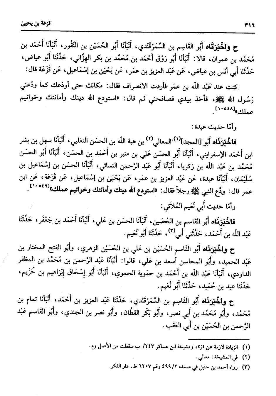 وأخبرناه أبو القاسم بن السمرقندي أنبأنا أبو الحسين بن النقور أنبأنا أحمد بن محمد بن عمران قالا أنبأنا أبو روق أحمد بن محمد بن بكر الهزاني حدثنا أبو عياض حدثنا أبي أنس بن عياض عن عبد العزيز بن عمر عن يحيى بن إسماعيل عن قزعة قال كنت عند عبد الله بن عمر فأردت الانصراف فقال مكانك حتى أودعك كما ودعني رسول الله (صلى الله عليه وسلم) فأخذ بيدي فصافحني ثم قال استودع الله دينك وأمانتك وخواتيم عملك
