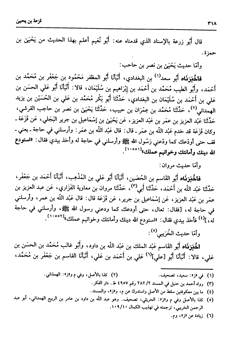 قال أبو زرعة بالإسناد الذي قدمناه عنه أبو نعيم أعلم بهذا الحديث من يحيى بن حمزة وأما حديث يحيى بن نصر بن حاجب فأخبرناه أبو سعد (1) بن البغدادي أنبأنا أبو المظفر محمود بن جعفر بن محمد بن أحمد وأبو الطيب محمد بن أحمد بن إبراهيم بن سليمان قالا أنبأنا أبو علي الحسن بن علي بن أحمد بن سليمان بن البغدادي حدثنا أبو بكر محمد بن علي بن الحسين بن يزيد الهمداني (2) حدثنا محمد بن عمران بن حبيب حدثنا يحيى بن نصر بن حاجب القرشي حدثنا عبد العزيز بن عمر بن عبد العزيز عن يحيى بن إسماعيل بن جرير البجلي عن قزعة وكان قزعة قد خدم عبد الله بن عمر قال قال عبد الله بن عمر وأرسلني في حاجة يعني قف حتى أودعك كما ودعني رسول الله (صلى الله عليه وسلم) وأرسلني في حاجة له وأخذ بيدي فقال استودع الله دينك وأمانتك وخواتيم عملك