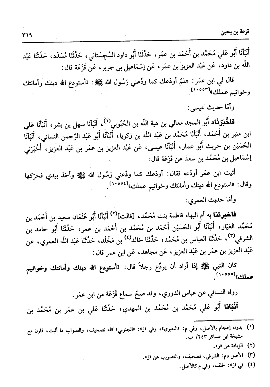 [10553] وأما حديث عيسى فأخبرناه أبو المجد معالي بن هبة الله بن الحبوبي (1) أنبأنا سهل بن بشر أنبأنا علي ابن منير بن أحمد أنبأنا محمد بن عبد الله بن زكريا أنبأنا أبو عبد الرحمن النسائي أنبأنا الحسين بن حريث أبو عمار أنبأنا عيسى عن عبد العزيز بن عمر بن عبد العزيز أخبرني إسماعيل بن محمد بن سعد عن قزعة قال أتيت ابن عمر أودعه فقال أودعك كما ودعني رسول الله (صلى الله عليه وسلم) وأخذ بيدي فحركها وقال استودع الله دينك وأمانتك وخواتيم عملك