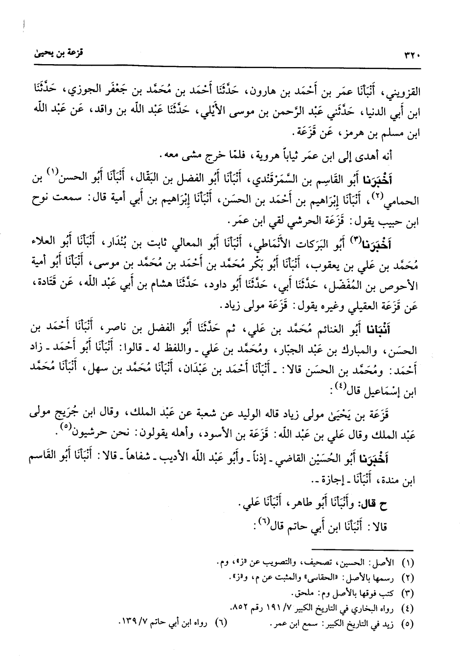 القزويني أنبأنا عمر بن أحمد بن هارون حدثنا أحمد بن محمد بن جعفر الجوزي حدثنا ابن أبي الدنيا حدثني عبد الرحمن بن موسى الأيلي حدثنا عبد الله بن واقد عن عبد الله ابن مسلم بن هرمز عن قزعة أنه أهدى إلى ابن عمر ثيابا هروية فلما خرج مشى معه أخبرنا أبو القاسم بن السمرقندي أنبأنا أبو الفضل بن البقال أنبأنا أبو الحسن (1) بن الحمامي (2) أنبأنا إبراهيم بن أحمد بن الحسن أنبأنا إبراهيم بن أبي أمية قال سمعت نوح ابن حبيب يقول قزعة الحرشي لقي ابن عمر أخبرنا (3) أبو البركات الأنماطي أنبأنا أبو المعالي ثابت بن بندار أنبأنا أبو العلاء محمد بن علي بن يعقوب أنبأنا أبو بكر محمد بن أحمد بن محمد بن موسى أنبأنا أبو أمية الأحوص بن المفضل حدثنا أبي حدثنا أبو داود حدثنا هشام بن أبي عبد الله عن قتادة عن قزعة العقيلي وغيره يقول قزعة مولى زياد أنبأنا أبو الغنائم محمد بن علي ثم حدثنا أبو الفضل بن ناصر أنبأنا أحمد بن الحسن والمبارك بن عبد الجبار ومحمد بن علي واللفظ له قالوا أنبأنا أبو أحمد زاد أحمد ومحمد بن الحسن قالا أنبأنا أحمد بن عبدان أنبأنا محمد بن سهل أنبأنا محمد ابن إسماعيل قال (4) قزعة بن يحيى مولى زياد قاله الوليد عن شعبة عن عبد الملك وقال ابن جريج مولى عبد الملك وقال علي بن عبد الله قزعة بن الأسود وأهله يقولون نحن حرشيون (5) أخبرنا أبو الحسين القاضي إذنا وأبو عبد الله الأديب شفاها قالا أنبأنا أبو القاسم ابن مندة أنبأنا إجازة قال وأنبأنا أبو طاهر أنبأنا علي قالا أنبأنا ابن أبي حاتم قال (6)