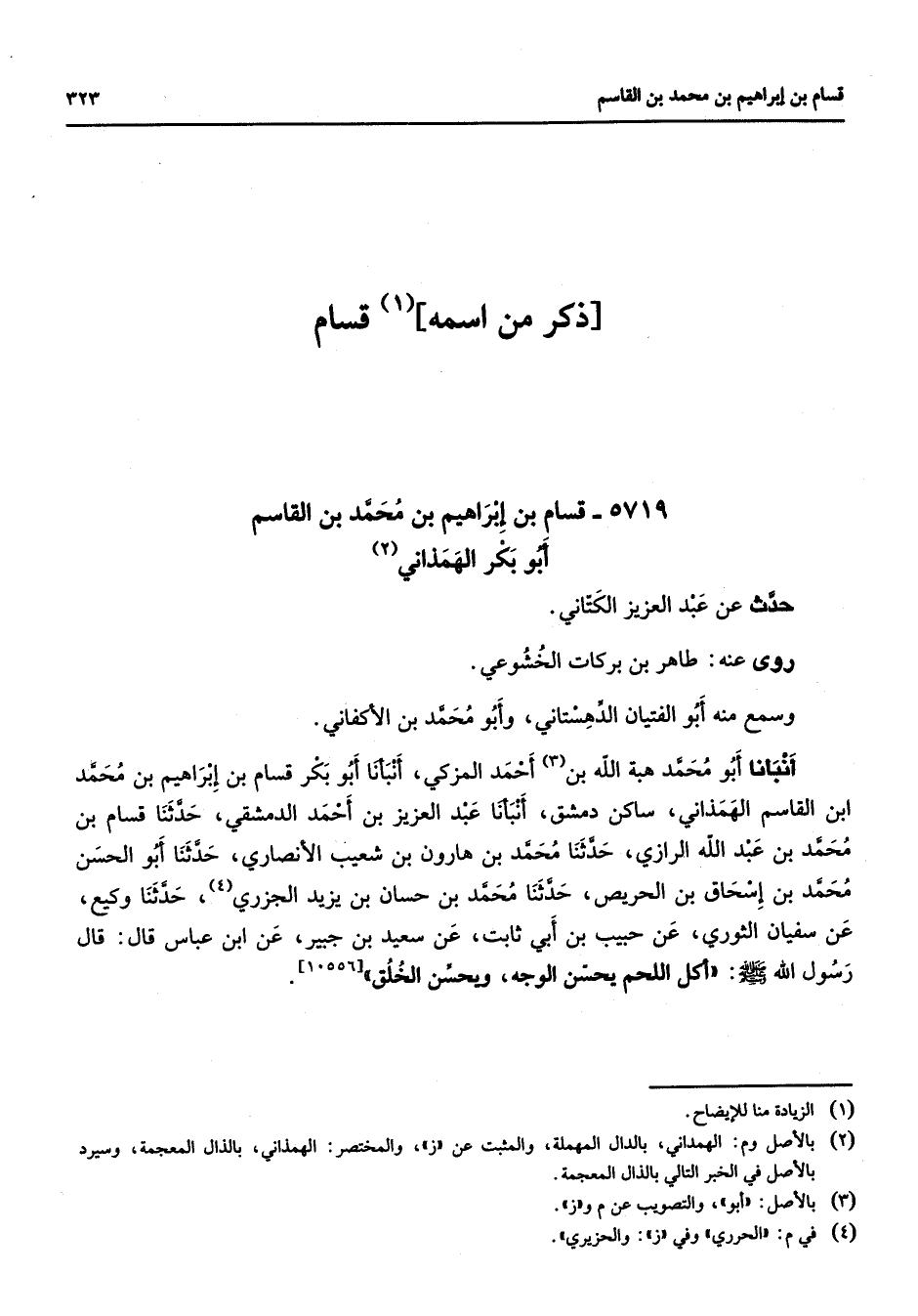 5719 - قسام بن إبراهيم بن محمد بن القاسم أبو بكر الهمذاني (2) حدث عن عبد العزيز الكتاني روى عنه طاهر بن بركات الخشوعي وسمع منه أبو الفتيان الدهستاني وأبو محمد بن الأكفاني أنبأنا أبو محمد هبة الله بن (3) أحمد المزكي أنبأنا أبو بكر قسام بن إبراهيم بن محمد ابن القاسم الهمذاني ساكن دمشق أنبأنا عبد العزيز بن أحمد الدمشقي حدثنا قسام بن محمد بن عبد الله الرازي حدثنا محمد بن هارون بن شعيب الأنصاري حدثنا أبو الحسن محمد بن إسحاق بن الحريص حدثنا محمد بن حسان بن يزيد الجزري (4) حدثنا وكيع عن سفيان الثوري عن حبيب بن أبي ثابت عن سعيد بن جبير عن ابن عباس قال قال رسول الله (صلى الله عليه وسلم) أكل اللحم يحسن الوجه ويحسن الخلق