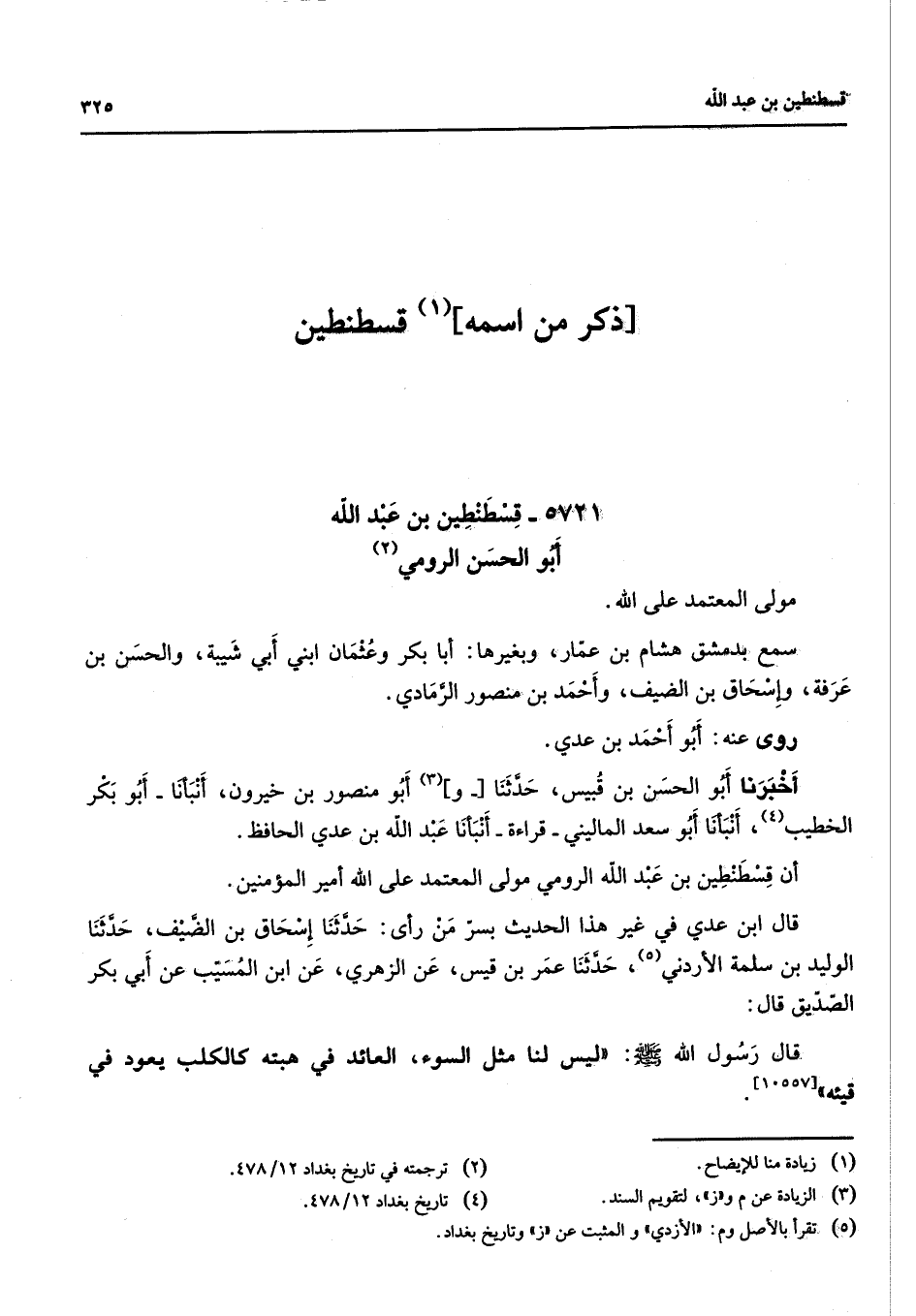5721 - قسطنطين بن عبد الله أبو الحسن الرومي (2) مولى المعتمد على الله سمع بدمشق هشام بن عمار وبغيرها أبا بكر وعثمان ابني أبي شيبة والحسن بن عرفة وإسحاق بن الضيف وأحمد بن منصور الرمادي روى عنه أبو أحمد بن عدي أخبرنا أبو الحسن بن قبيس حدثنا و (3) أبو منصور بن خيرون أنبأنا أبو بكر الخطيب (4) أنبأنا أبو سعد الماليني قراءة أنبأنا عبد الله بن عدي الحافظ أن قسطنطين بن عبد الله الرومي مولى المعتمد على الله أمير المؤمنين قال ابن عدي في غير هذا الحديث بسر من رأى حدثنا إسحاق بن الضيف حدثنا الوليد بن سلمة الأردني (5) حدثنا عمر بن قيس عن الزهري عن ابن المسيب عن أبي بكر الصديق قال قال رسول الله (صلى الله عليه وسلم) ليس لنا مثل السوء العائد في هبته كالكلب يعود في قيئه