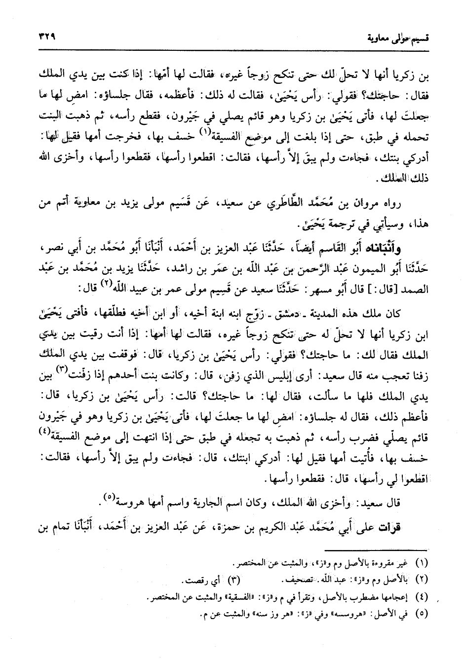 بن زكريا أنها لا تحل لك حتى تنكح زوجا غيره فقالت لها أمها إذا كنت بين يدي الملك فقال حاجتك فقولي رأس يحيى فقالت له ذلك فأعظمه فقال جلساؤه امض لها ما جعلت لها فأتى يحيى بن زكريا وهو قائم يصلي في جيرون فقطع رأسه ثم ذهبت البنت تحمله في طبق حتى إذا بلغت إلى موضع الفسيقة (1) خسف بها فخرجت أمها فقيل لها أدركي بنتك فجاءت ولم يبق إلا رأسها فقالت اقطعوا رأسها فقطعوا رأسها وأخزى الله ذلك الملك رواه مروان بن محمد الطاطري عن سعيد عن قسيم مولى يزيد بن معاوية أتم من هذا وسيأتي في ترجمة يحيى وأنبأناه أبو القاسم أيضا حدثنا عبد العزيز بن أحمد أنبأنا أبو محمد بن أبي نصر حدثنا أبو الميمون عبد الرحمن بن عبد الله بن عمر بن راشد حدثنا يزيد بن محمد بن عبد الصمد قال قال أبو مسهر حدثنا سعيد بن قسيم مولى عمر بن عبيد الله (2) قال كان ملك هذه المدينة دمشق زوج ابنه ابنة أخيه أو ابن أخيه فطلقها فأفتى يحيى ابن زكريا أنها لا تحل له حتى تنكح زوجا غيره فقالت لها أمها إذا أنت رقيت بين يدي الملك فقال لك ما حاجتك فقولي رأس يحيى بن زكريا قال فوقفت بين يدي الملك زفنا تعجب منه قال سعيد أرى إبليس الذي زفن قال وكانت بنت أحدهم إذا زفنت (3) بين يدي الملك فلها ما سألت فقال لها ما حاجتك قالت رأس يحيى بن زكريا قال فأعظم ذلك فقال له جلساؤه امض لها ما جعلت لها فأتى يحيى بن زكريا وهو في جيرون قائم يصلي فضرب رأسه ثم ذهبت به تجعله في طبق حتى إذا انتهت إلى موضع الفسيقة (4) خسف بها فأتيت أمها فقيل لها أدركي ابنتك قال فجاءت ولم يبق إلا رأسها فقالت اقطعوا لي رأسها قال فقطعوا رأسها قال سعيد وأخزى الله الملك وكان اسم الجارية واسم أمها هروسة (5) قرأت على أبي محمد عبد الكريم بن حمزة عن عبد العزيز بن أحمد أنبأنا تمام بن
