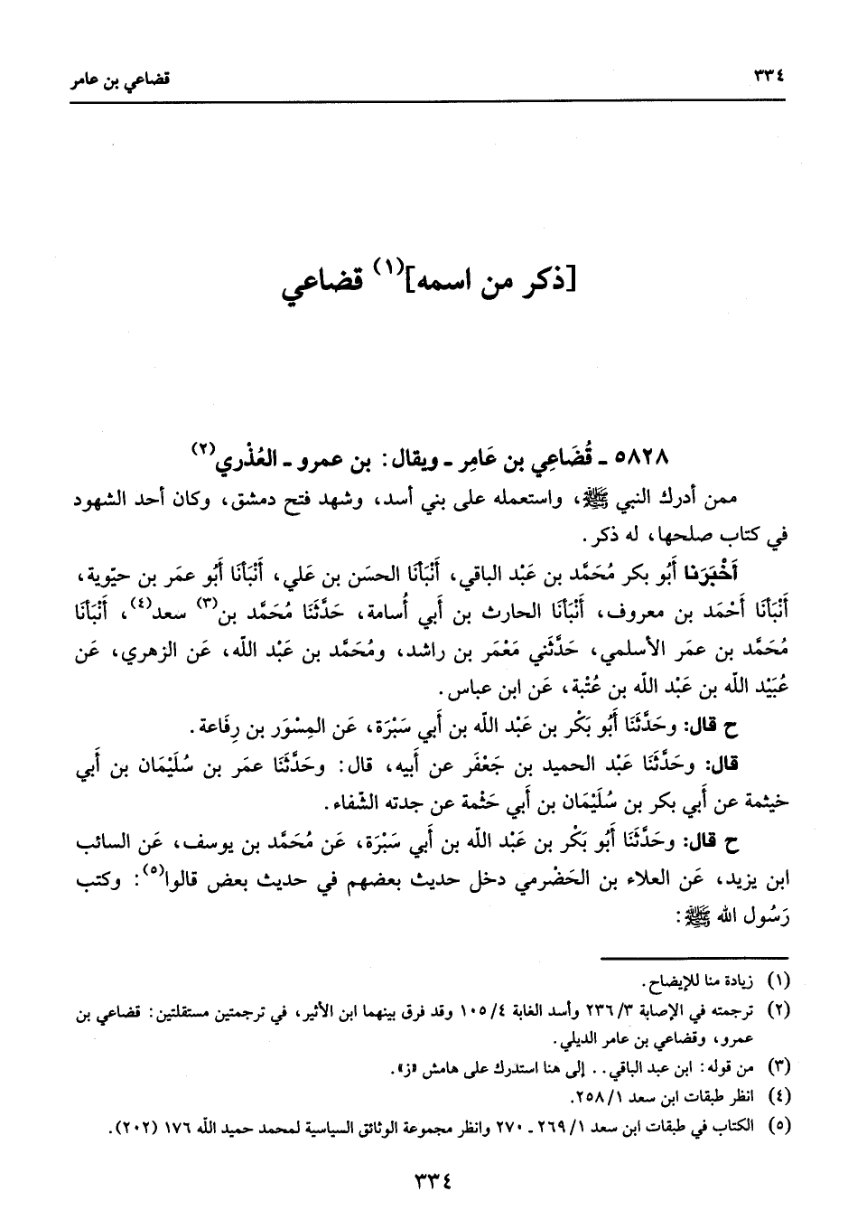 5728 - قضاعي بن عامر ويقال بن عمرو العذري (2) ممن أدرك النبي (صلى الله عليه وسلم) واستعمله على بني أسد وشهد فتح دمشق وكان أحد الشهود في كتاب صلحها له ذكر أخبرنا أبو بكر محمد بن عبد الباقي أنبأنا الحسن بن علي أنبأنا أبو عمر بن حيوية أنبأنا أحمد بن معروف أنبأنا الحارث بن أبي أسامة حدثنا محمد بن (3) سعد (4) أنبأنا محمد بن عمر الأسلمي حدثني معمر بن راشد ومحمد بن عبد الله عن الزهري عن عبيد الله بن عبد الله بن عتبة عن ابن عباس قال وحدثنا أبو بكر بن عبد الله بن أبي سبرة عن المسور بن رفاعة قال وحدثنا عبد الحميد بن جعفر عن أبيه قال وحدثنا عمر بن سليمان بن أبي خيثمة عن أبي بكر بن سليمان بن أبي حثمة عن جدته الشفاء قال وحدثنا أبو بكر بن عبد الله بن أبي سبرة عن محمد بن يوسف عن السائب ابن يزيد عن العلاء بن الحضرمي دخل حديث بعضهم في حديث بعض قالوا (5) وكتب رسول الله (صلى الله عليه وسلم)