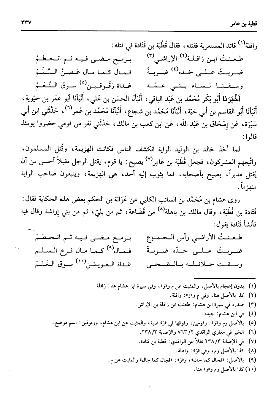 رافلة (1) قائد المستعربة فقتله فقال قطبة بن قتادة في قتله * طعنت ابن زافلة (2) الإراشي * (3) برمح مضى فيه ثم انحطم ضربت على خده (4) ضربة * فمال كما مال غصن السلم وسقنا نساء بني عمه * غداة رقوقين (5) سوق النعم * أخبرنا أبو بكر محمد بن عبد الباقي أنبأنا الحسن بن علي أنبأنا أبو عمر بن حيوية أنبأنا أبو القاسم بن أبي حية أنبأنا محمد بن شجاع أنبأنا محمد بن عمر (6) حدثني ابن أبي سبرة عن إسحاق بن عبد الله عن ابن كعب بن مالك حدثني نفر من قومي حضروا يومئذ قالوا لما أخذ خالد بن الوليد الراية انكشف الناس فكانت الهزيمة وقتل المسلمون واتبعهم المشركون فجعل قطبة بن عامر (7) يصيح يا قوم يقتل الرجل مقبلا أحسن من أن يقتل مدبرا يصيح بأصحابه فما يثوب إليه أحد هي الهزيمة ويتبعون صاحب الراية منهزما روى هشام بن محمد بن السائب الكلبي عن عوانة بن الحكم بعض هذه الحكاية فقال قتادة بن قطبة وقال مالك بن باهلة (8) من قضاعة ثم من بلي ثم من بني إراشة وقال فيه فأنشأ قتادة يقول * طعنت الأراشي رأس الجموع * برمح مضى فيه ثم انحطم ضربت على خده ضربة * فمال (9) كما مال فرخ السلم وسقت حلائله بالضحى * غداة العويقن (10) سوق الغنم *